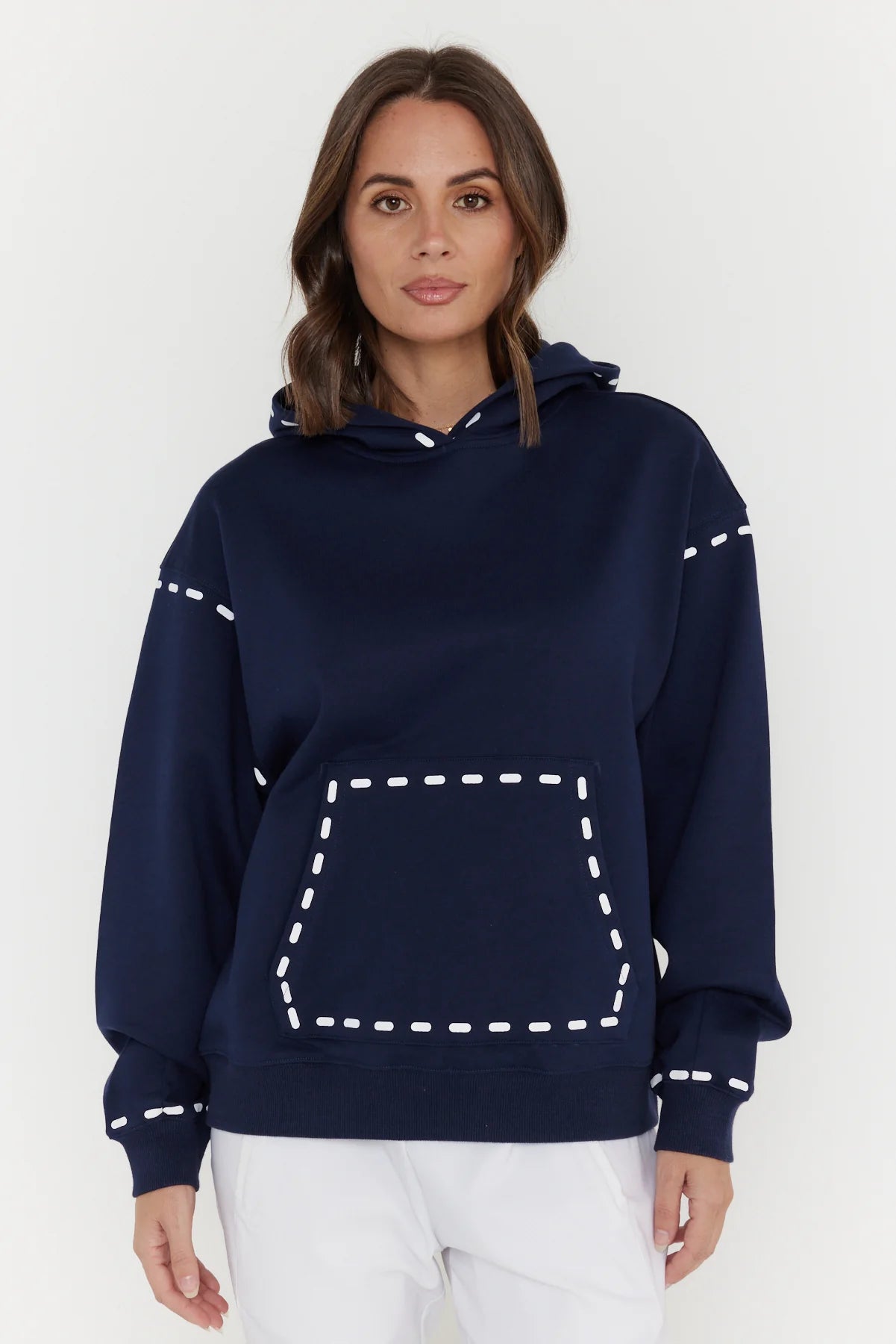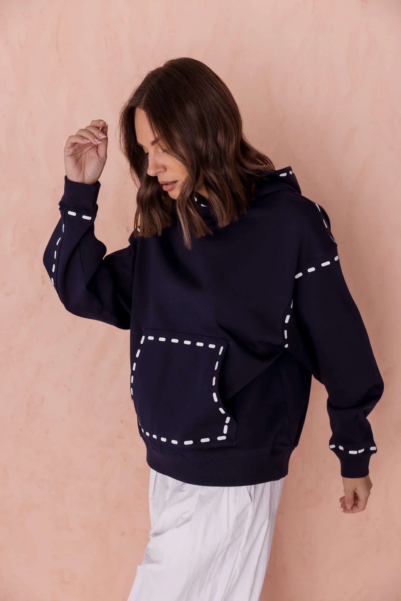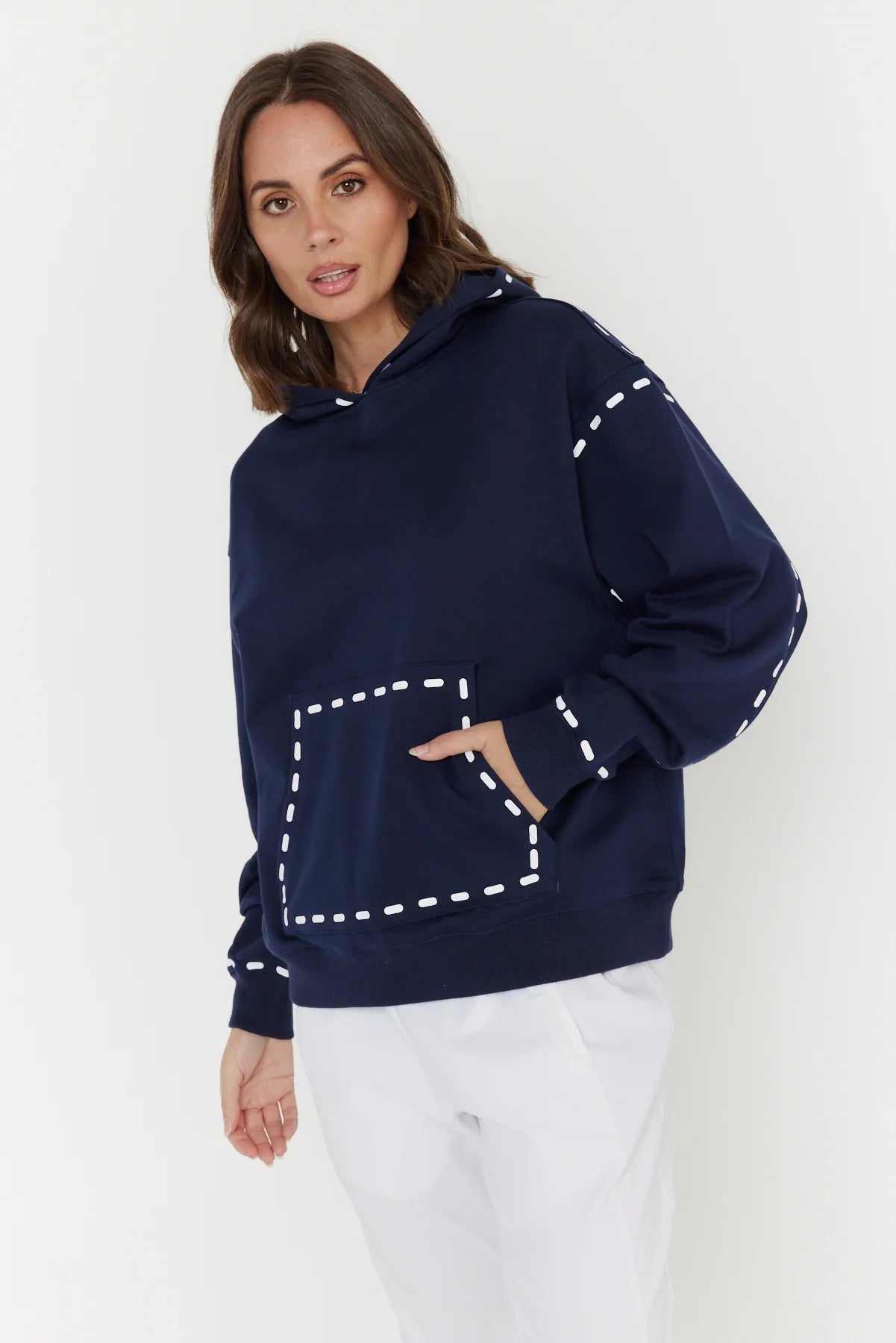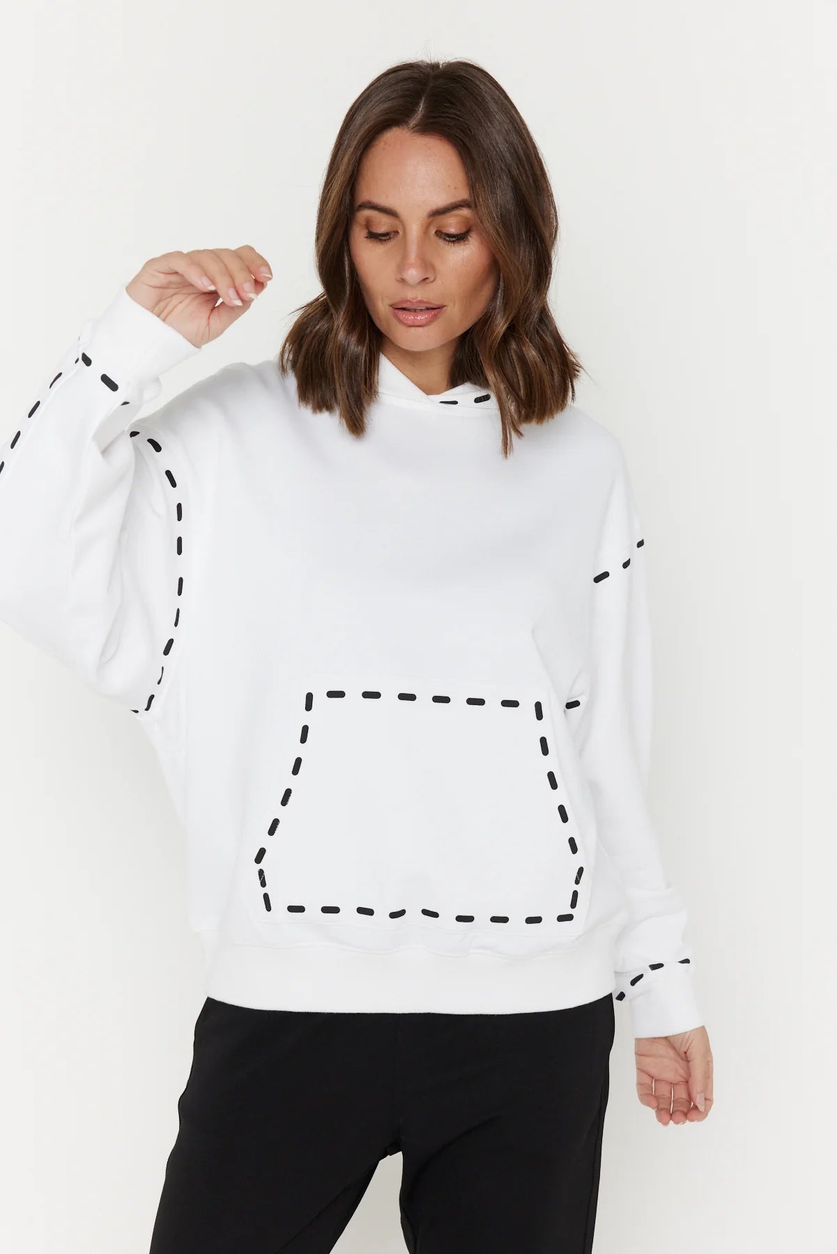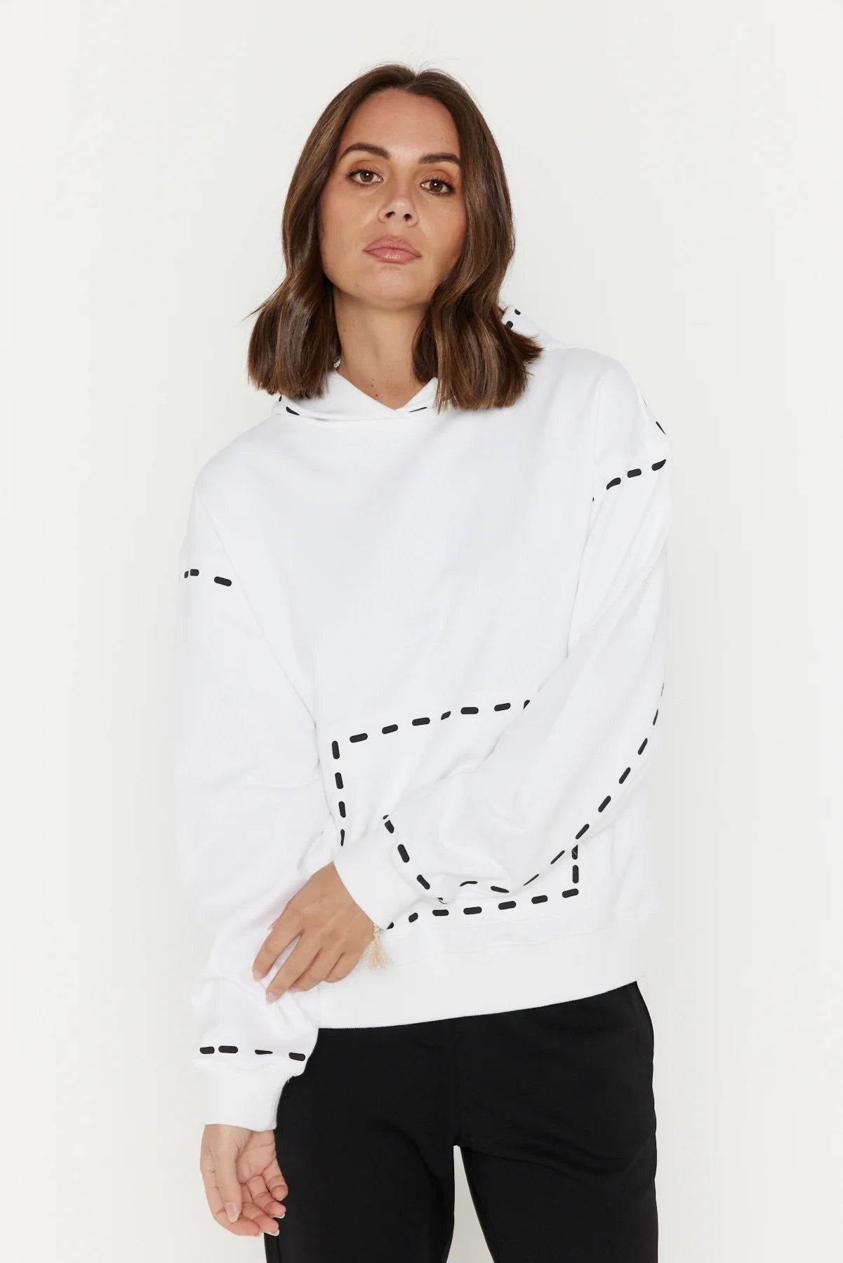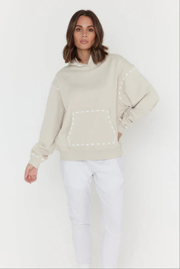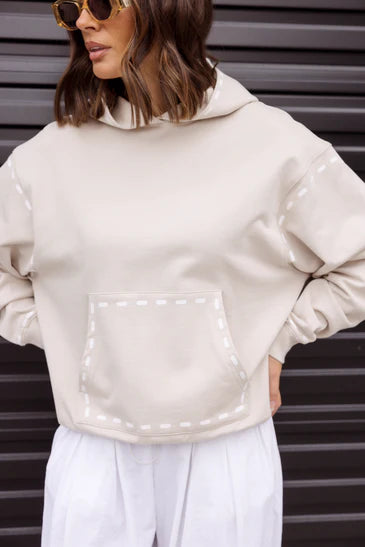 The Alexandra Dashes Jumper exudes understated sophistication with its contrast dash graphic detailing on the hood, pocket, wrist, and upper arm. Featuring dropped shoulders and a relaxed fit through the body and sleeves, it delivers effortless elegance and comfort. Ribbed trims at the cuffs and hem provide a polished finish, complemented by the timeless kangaroo front pocket. Crafted from 100% premium mid-weight cotton, this jumper offers both refined texture and enduring quality for a stylish wardrobe staple.