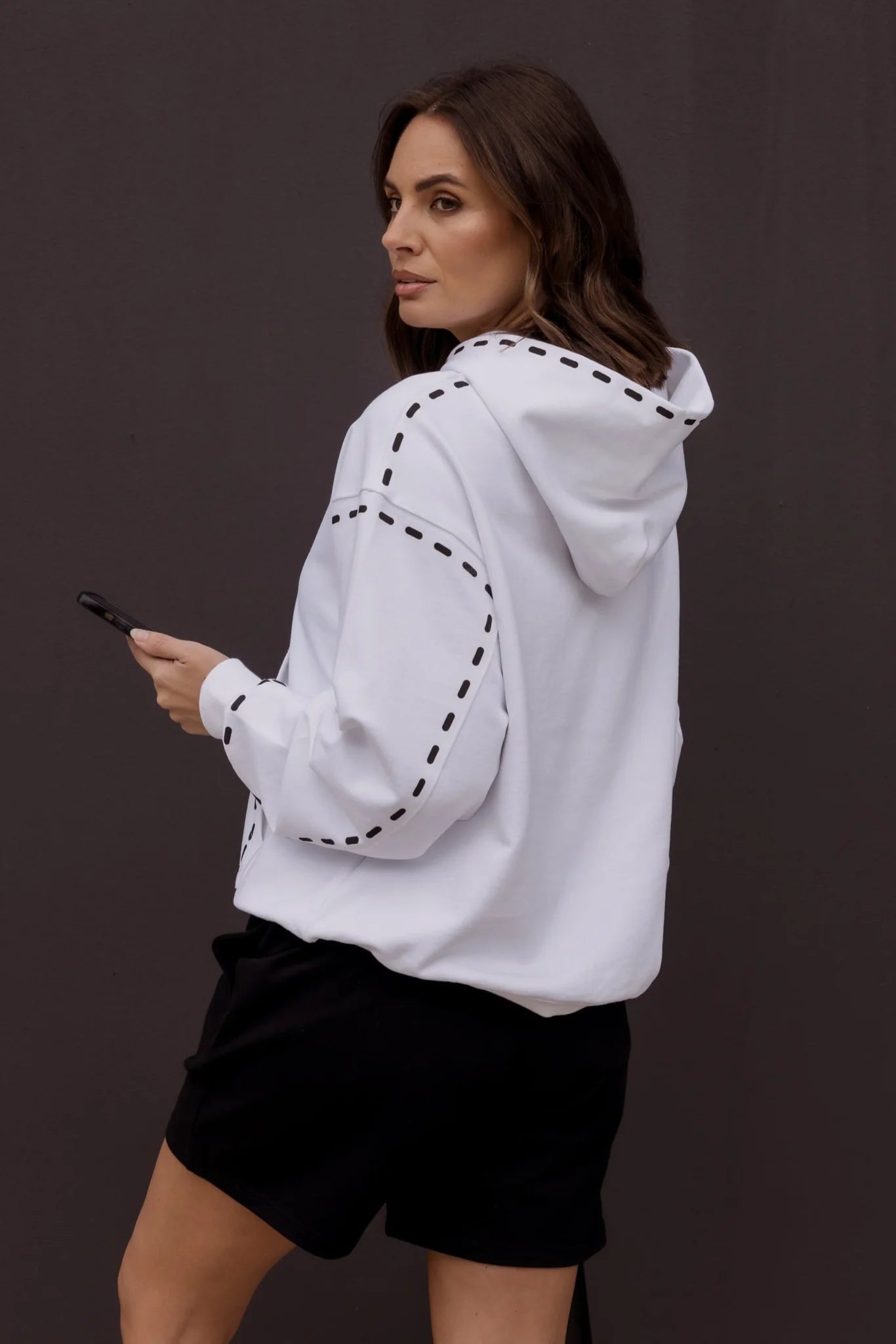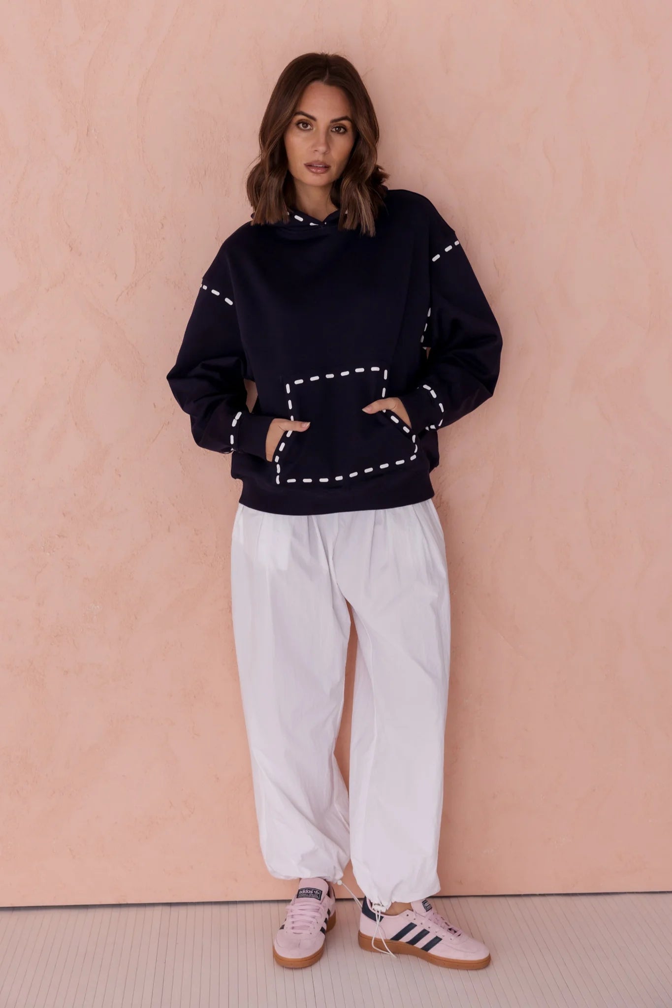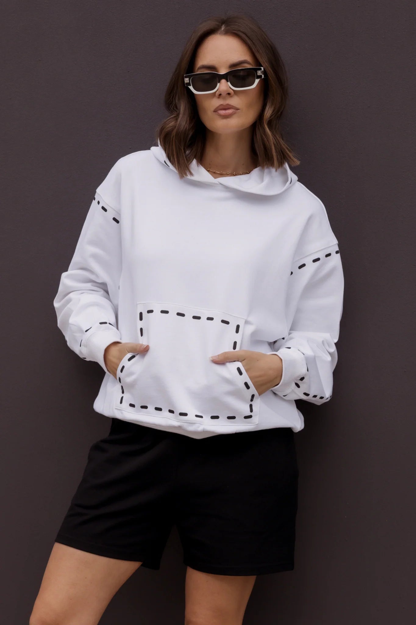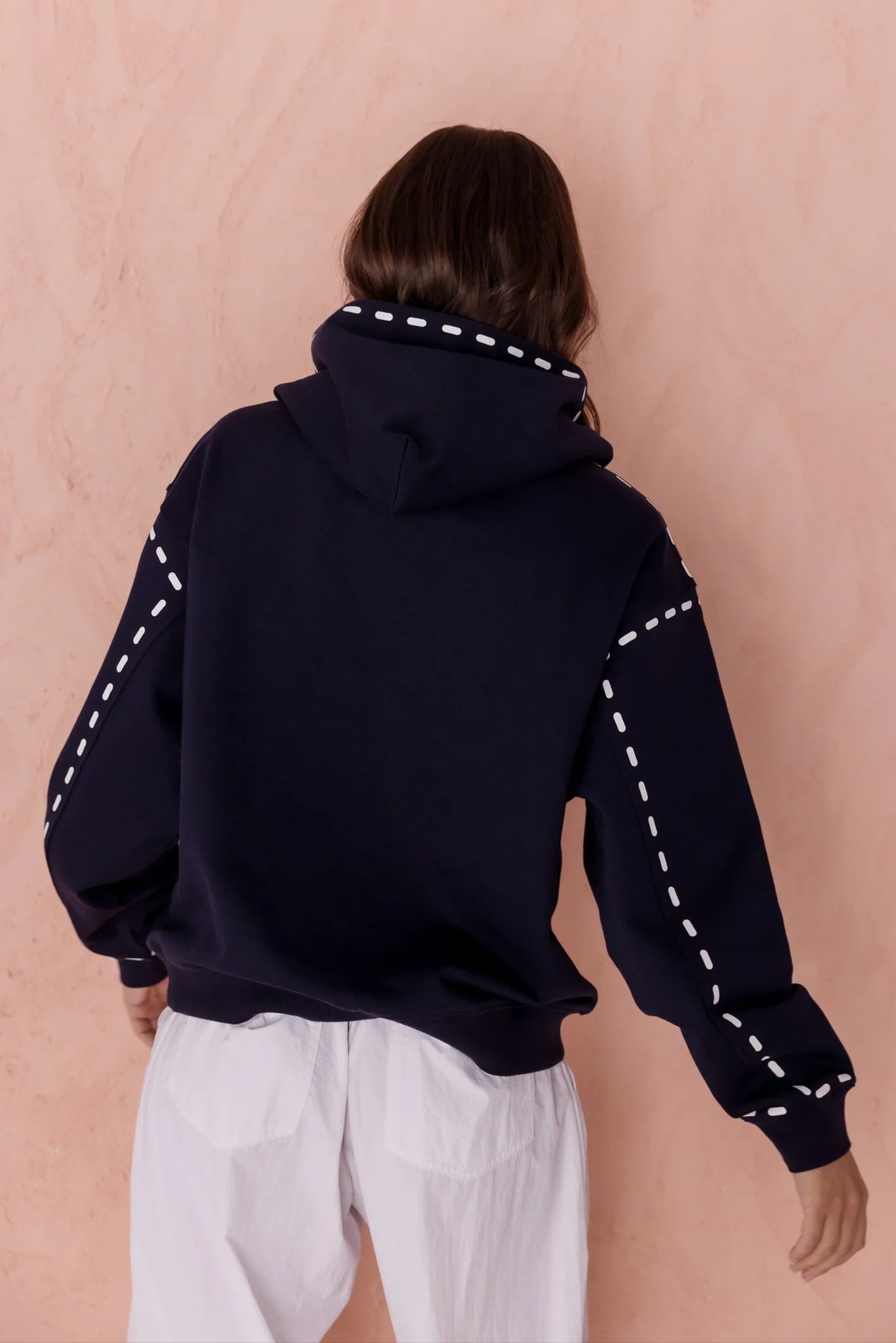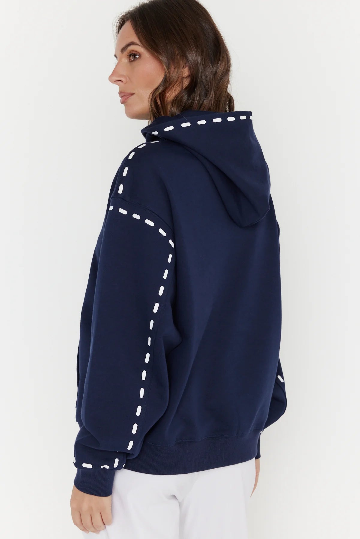 The Alexandra Dashes Jumper exudes understated sophistication with its contrast dash graphic detailing on the hood, pocket, wrist, and upper arm. Featuring dropped shoulders and a relaxed fit through the body and sleeves, it delivers effortless elegance and comfort. Ribbed trims at the cuffs and hem provide a polished finish, complemented by the timeless kangaroo front pocket. Crafted from 100% premium mid-weight cotton, this jumper offers both refined texture and enduring quality for a stylish wardrobe staple.