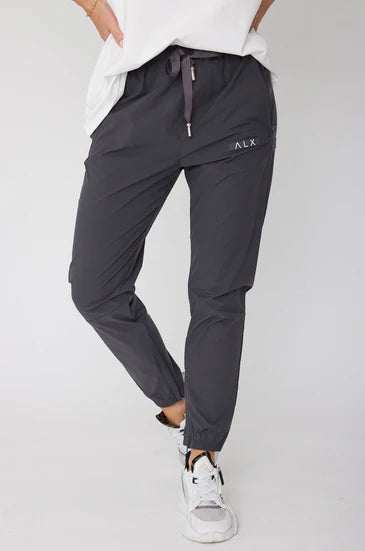 The black WOLFGANG jogger offers a comfortable, lightweight option for everyday tasks. It features an elasticated waist with a ribbon drawstring, front pockets, ALX rubber branding, and hidden zips on the inside calf, embodying a stylish and athletic look.