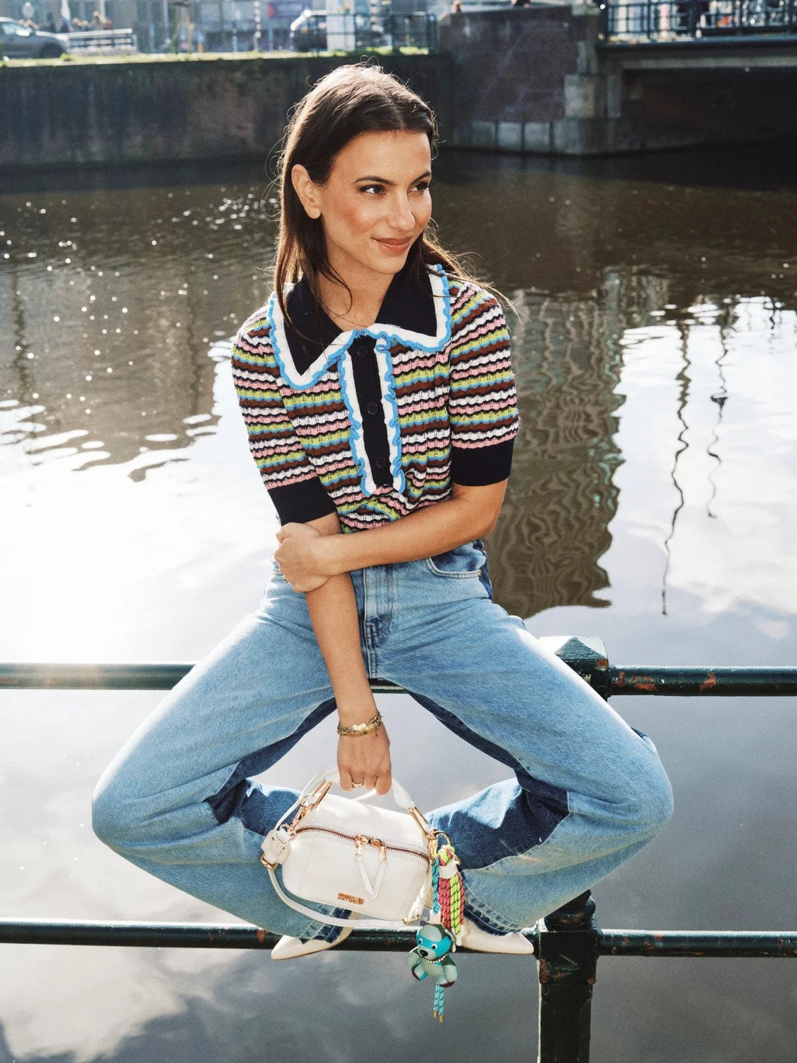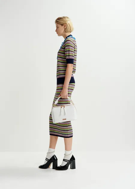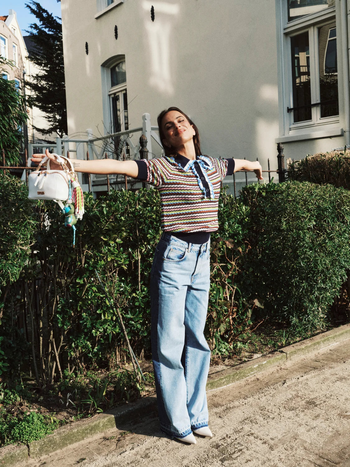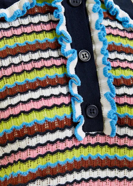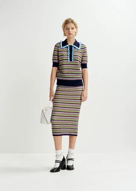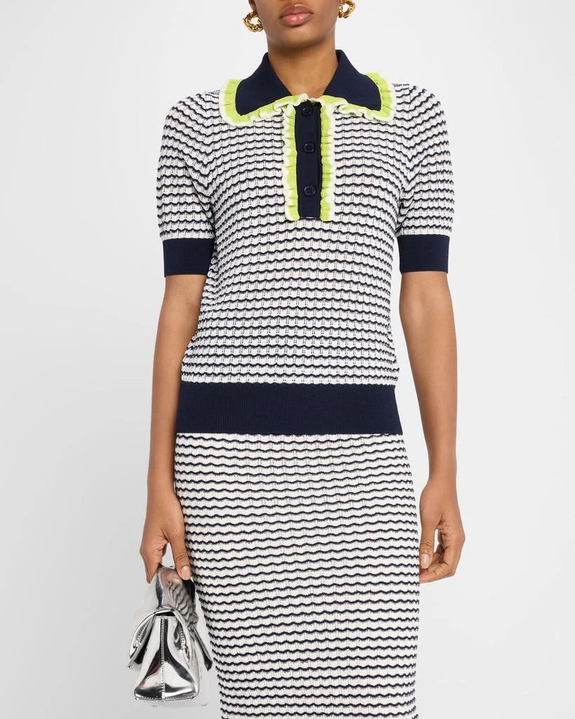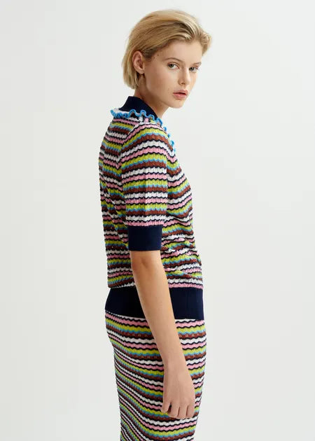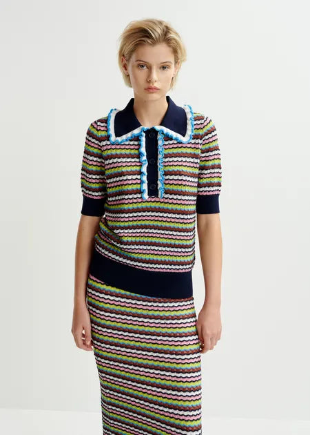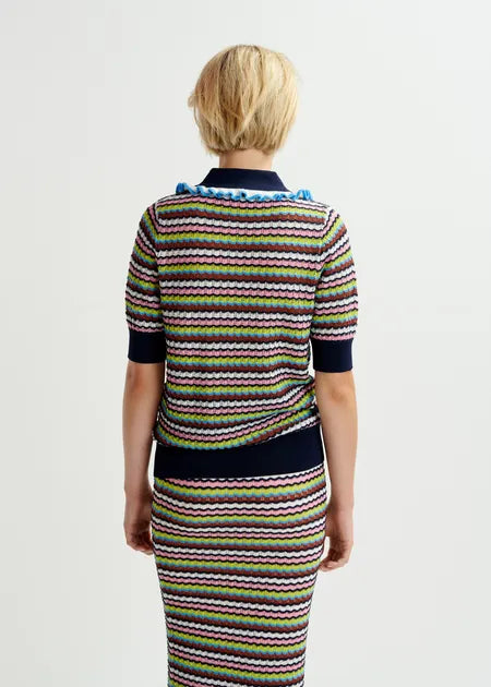 The Essentiel Antwerp - Haximum Striped Polo boasts a relaxed fit allowing for an effortless combination with high-waisted bottoms. The addition of a ruffled collar adds a sophisticated touch, while the bold striped design and contrasting trim draw the eye. Created with recycled polyester, this polo is a mid-weight knit, designed for both comfort and style. Ribbed trims provide a structured look.