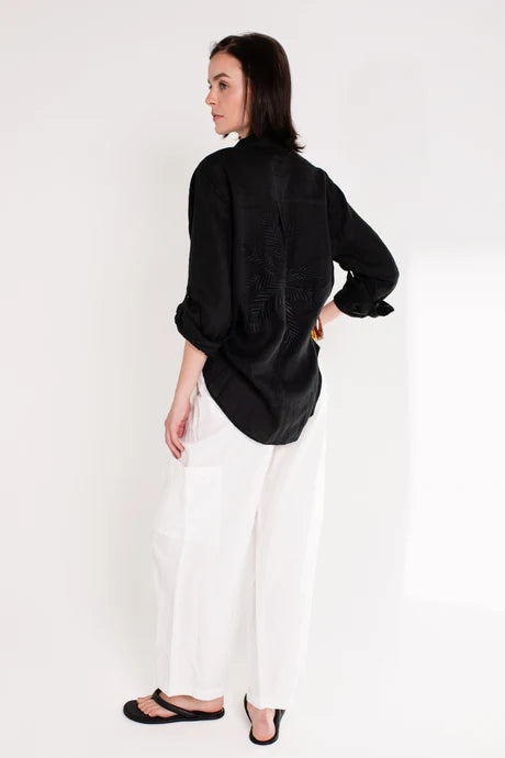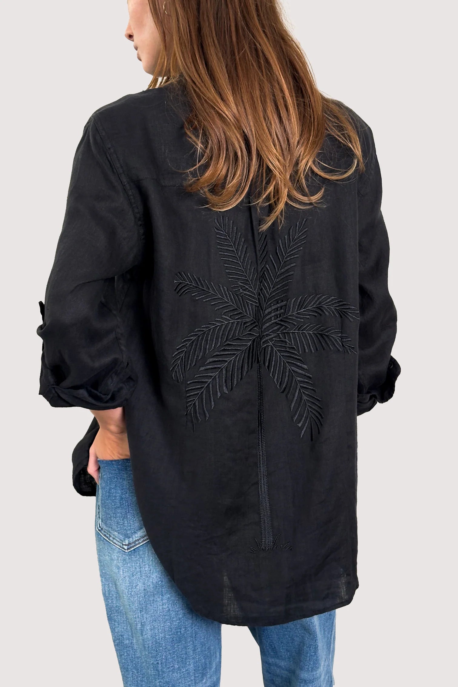 Stand out in this sophisticated black Boyfriend Shirt featuring an exquisite full-back embroidered palm tree design that adds a refined touch of summer elegance. This exceptional piece combines versatility with distinctive style - perfect for pairing with swimwear during coastal getaways or island vacations.
