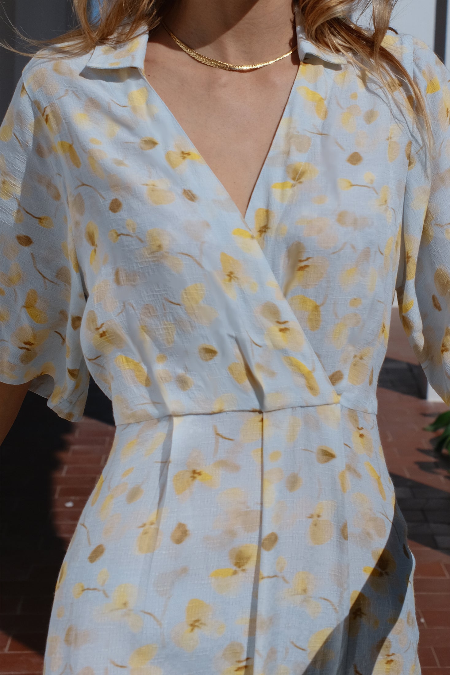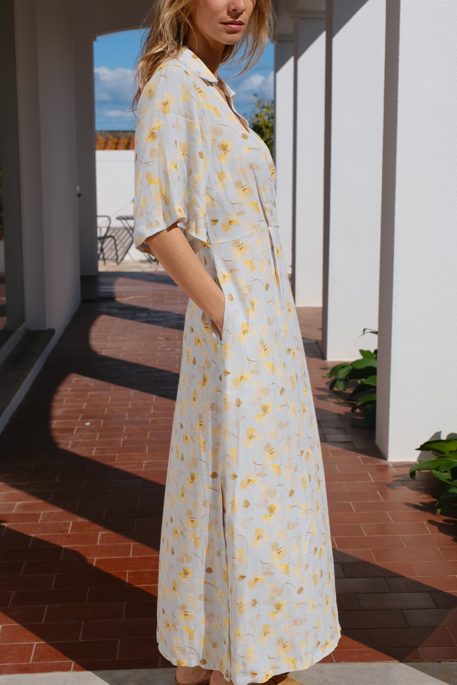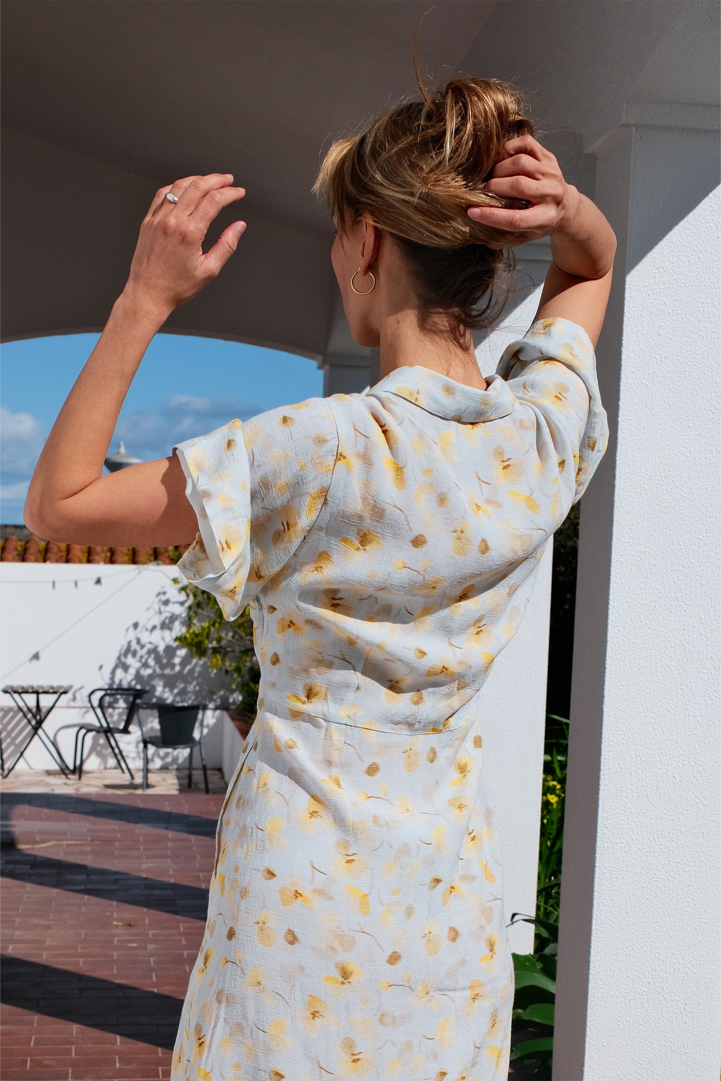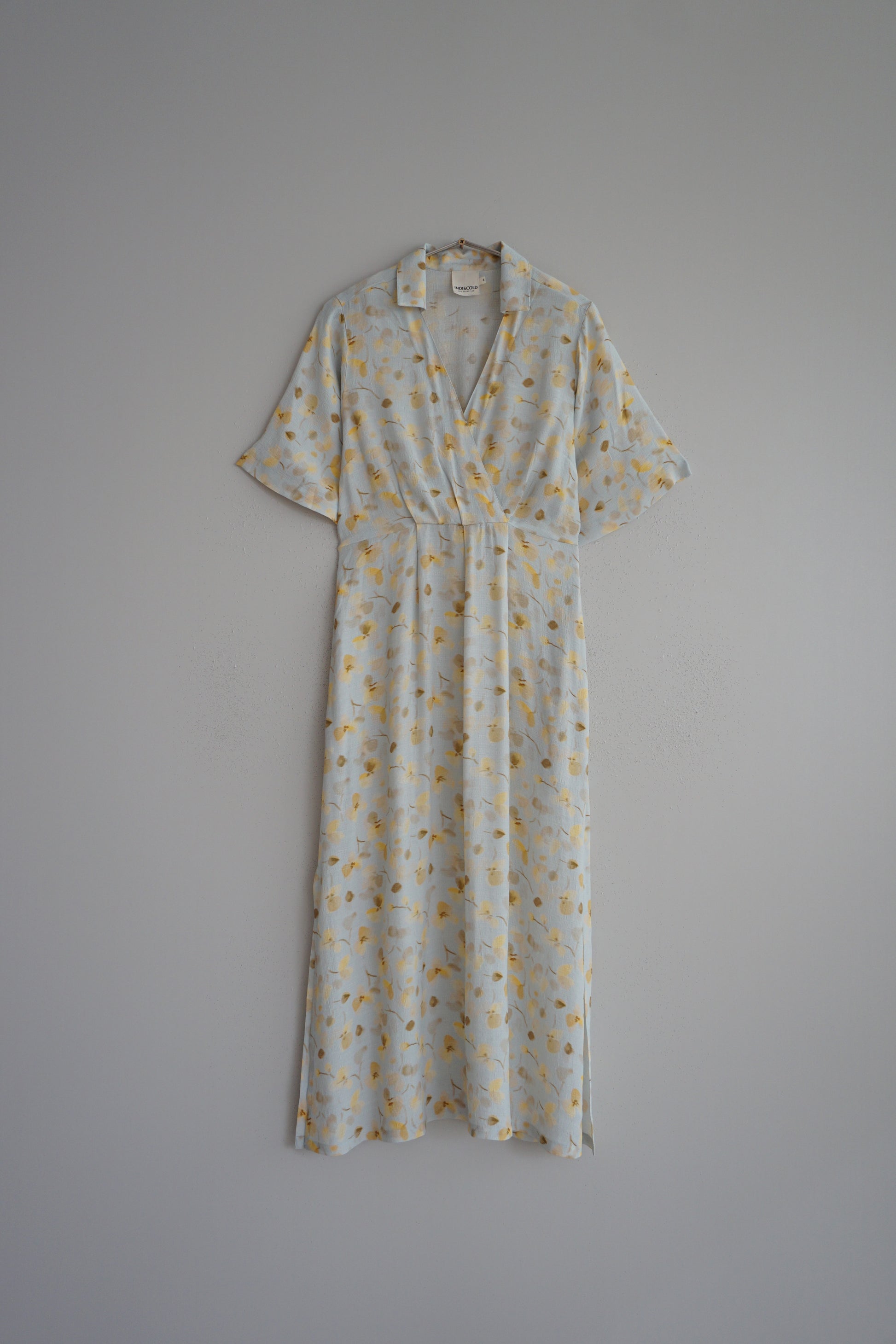 This dress combines a shirt collar with a crossover neckline for a versatile look suitable for any occasion. It features a waist-defined cut, concealed side zipper, and inset seam pockets with bottom slits. Crafted from viscose fabric adorned with a digital orchid print, it offers a flowing silhouette with fitted shoulders and slightly wide short sleeves. Designed with a slim fit, it provides a tailored, close-to-body shape.