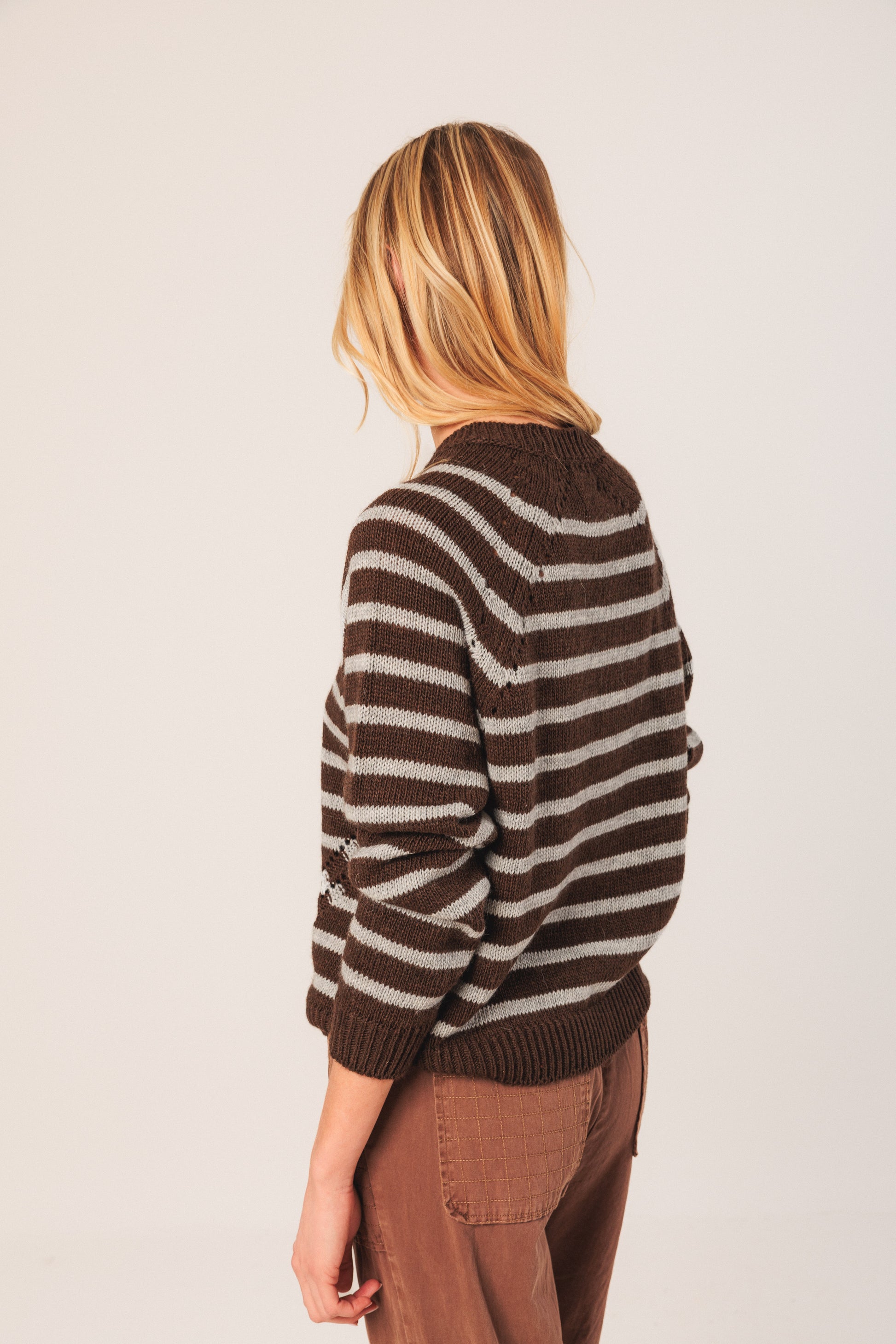 This striking two-toned stripe sweater channels a nautical edge with a tonal twist. Featuring bold bidirectional waist detailing and an effortlessly relaxed fit, this knit piece refuses to blend in.