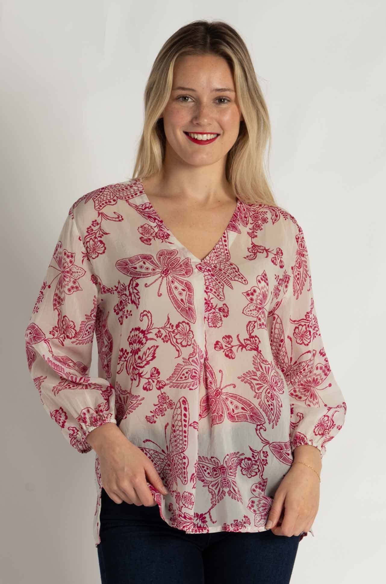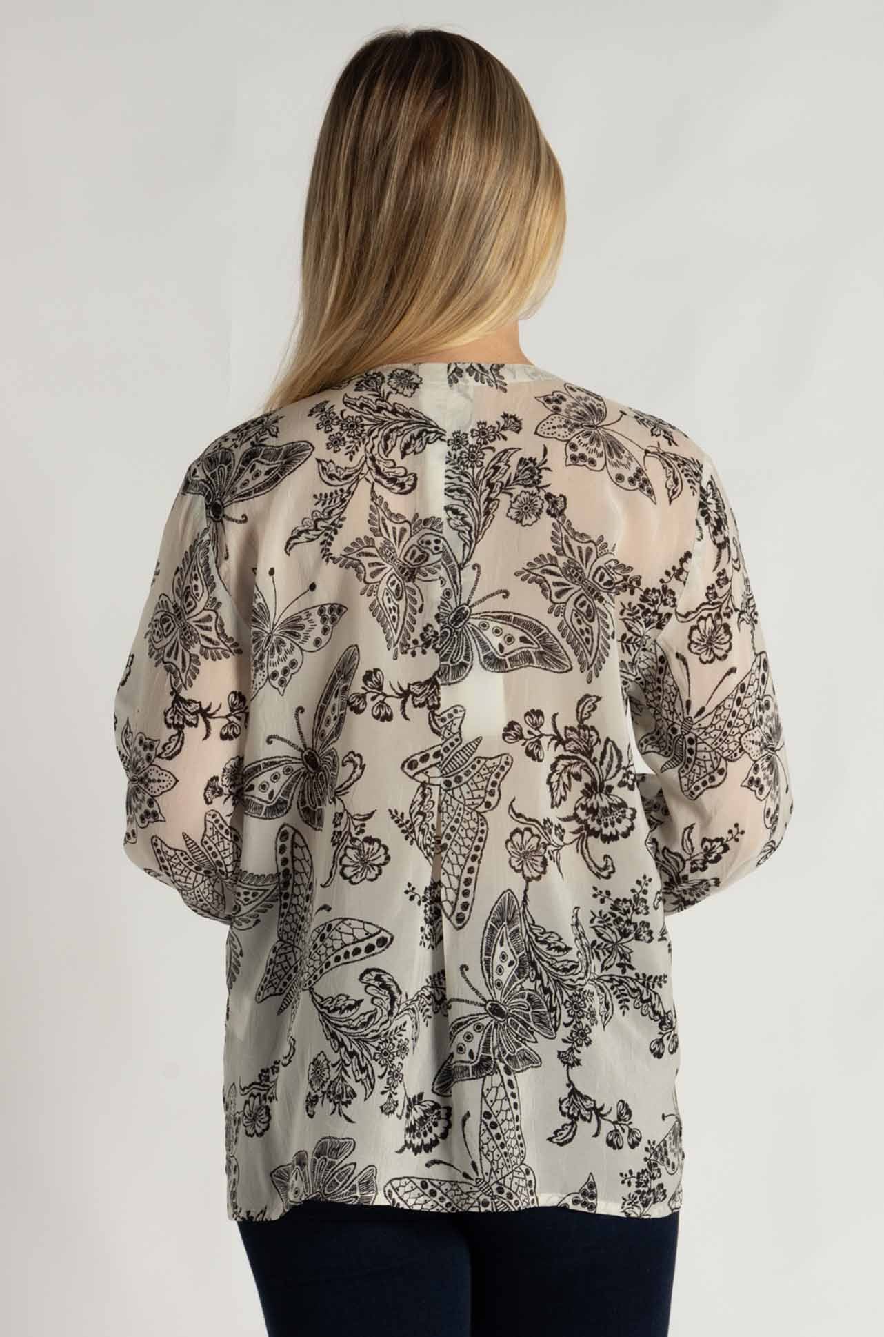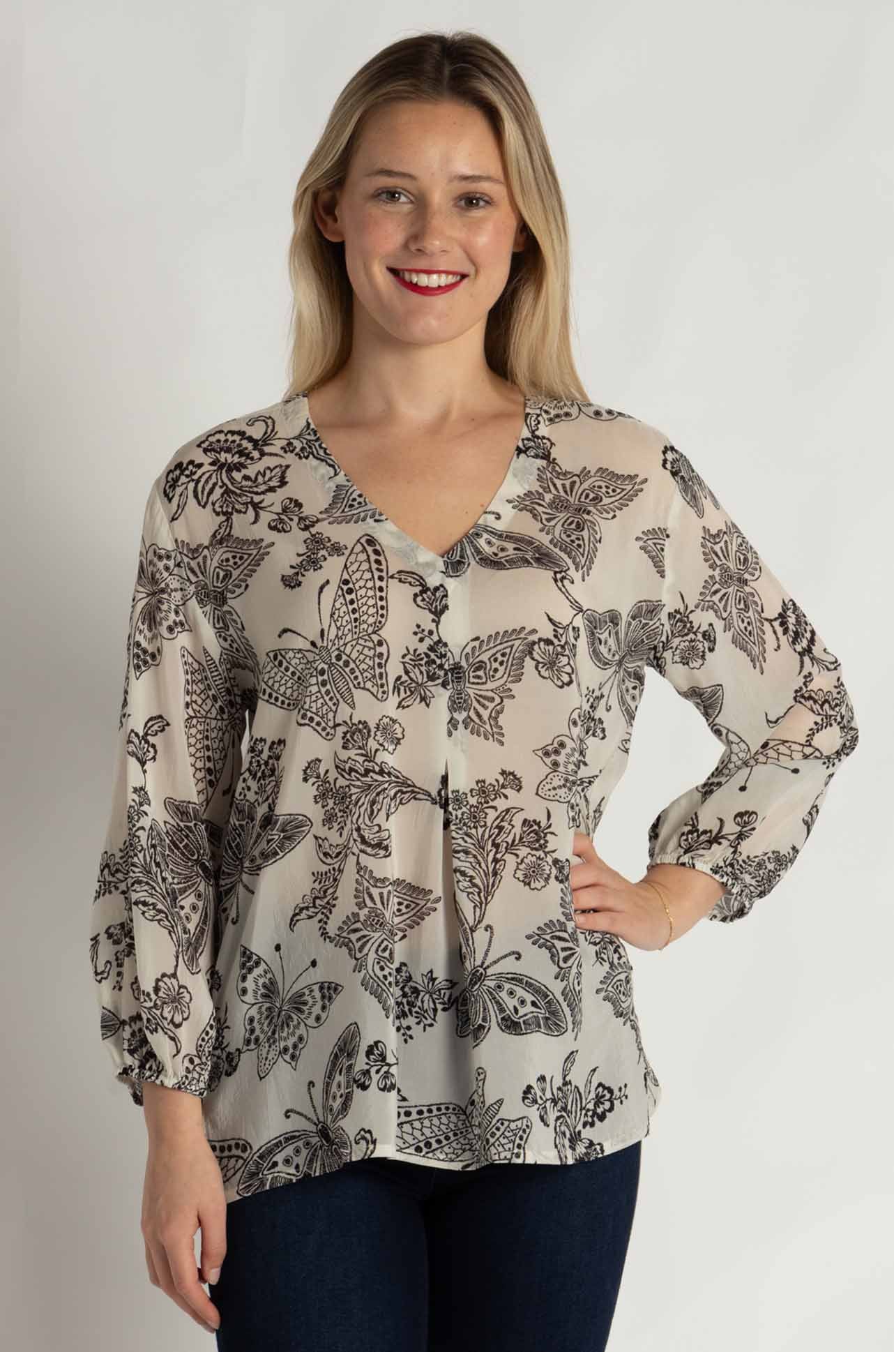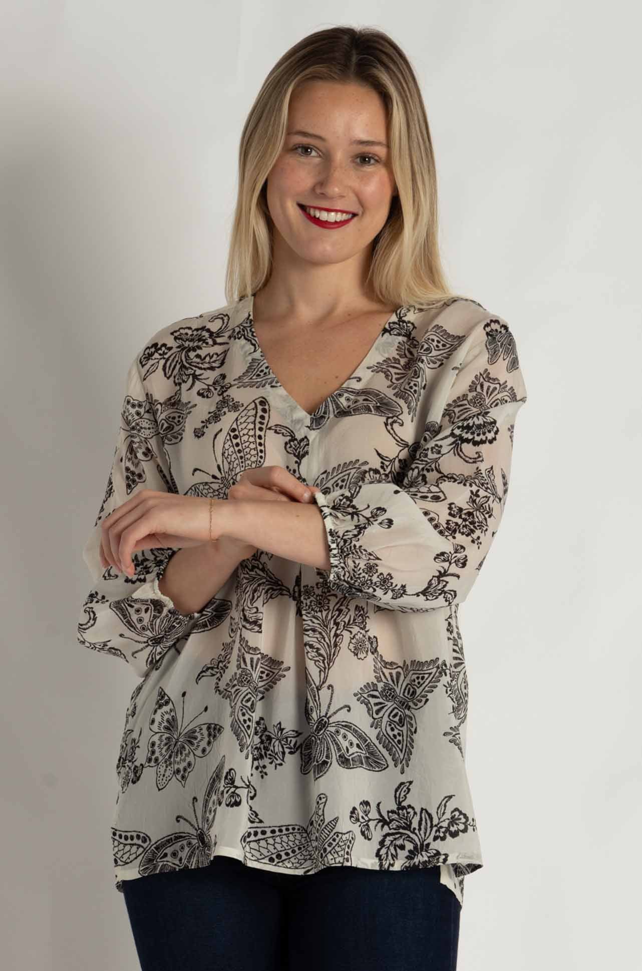 The Arlo Blouse by Johnny Was, showcased in the ‘Sydnee’ print, is a classic piece crafted from breathable 100% rayon. This lightweight blouse features intricate embroidered eyelet cutwork with a monochrome butterfly design. Its relaxed fit, button-down front, and scalloped hem make it an elegant choice for layering or wearing on its own.