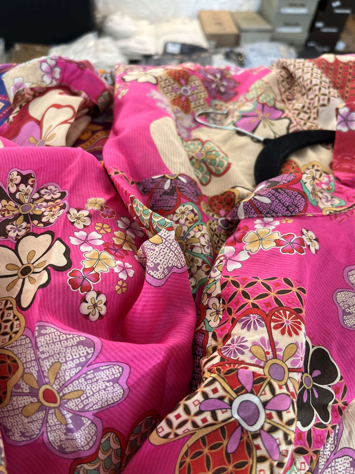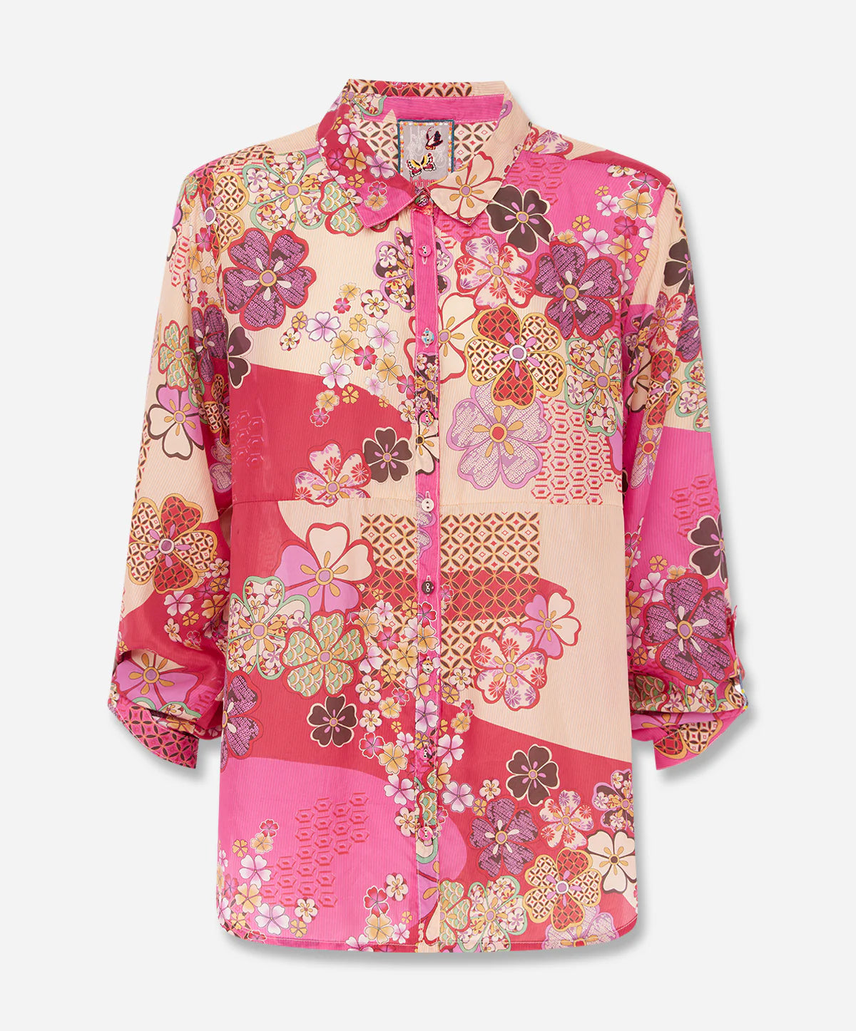 The 'Colette Blouse in Yama' from Johnny Was presents vibrant shades and striking floral patterns. This impressive silk shirt, made from 100% silk, is embellished with a front button closure, traditional collar, and long sleeves with cuffs. The bright mix of fuchsia and cream hues beautifully complements any ensemble, especially denim, for a luxurious boho aesthetic.