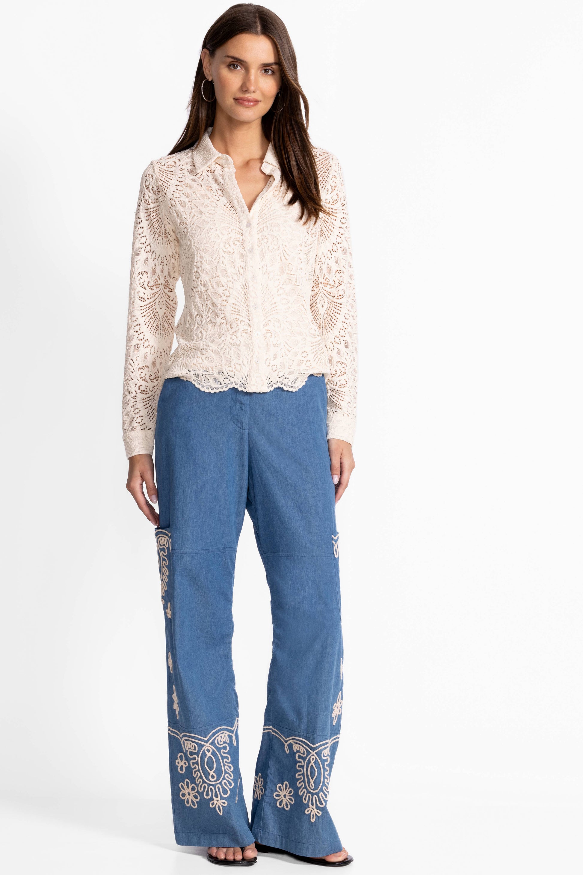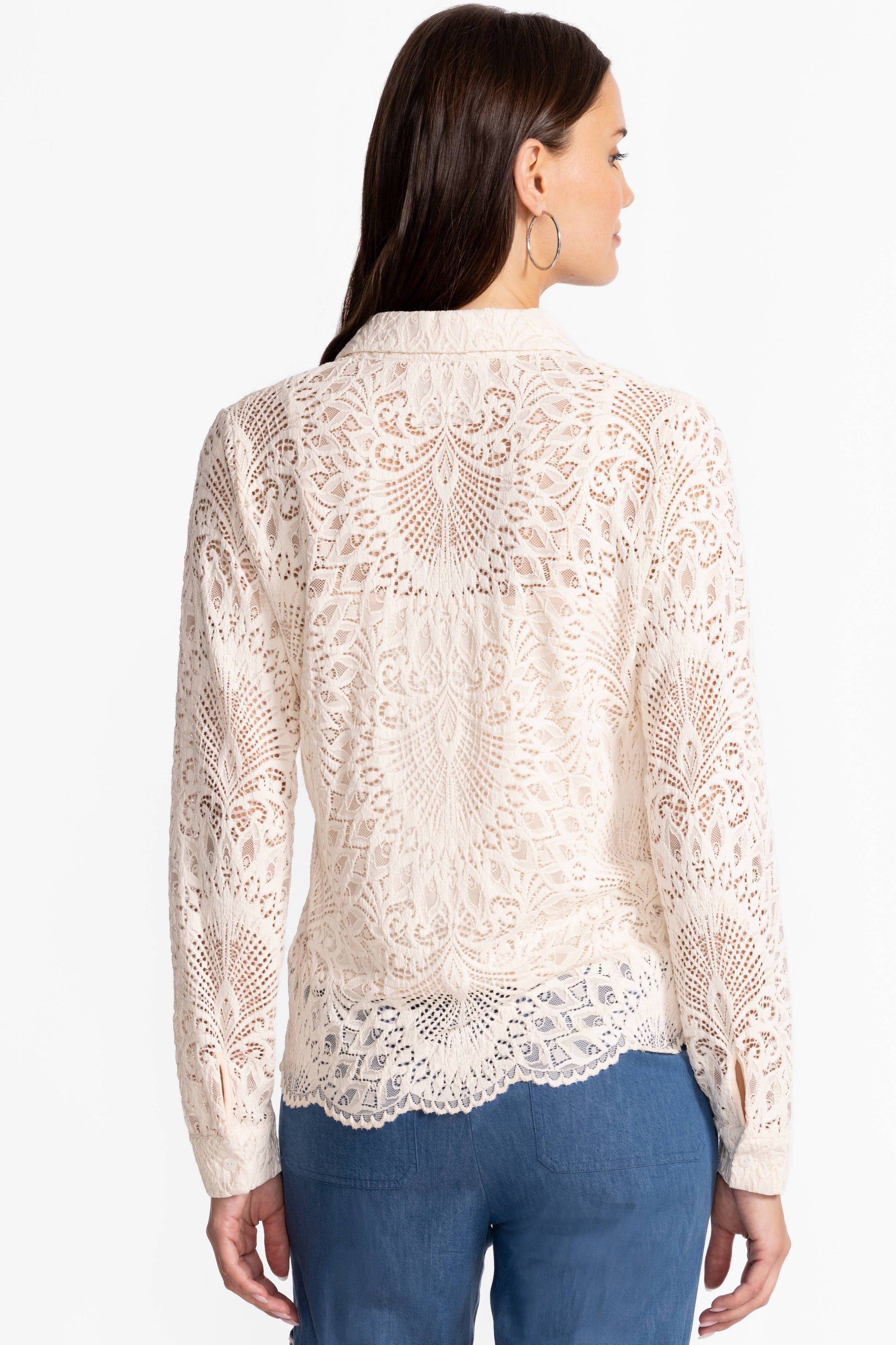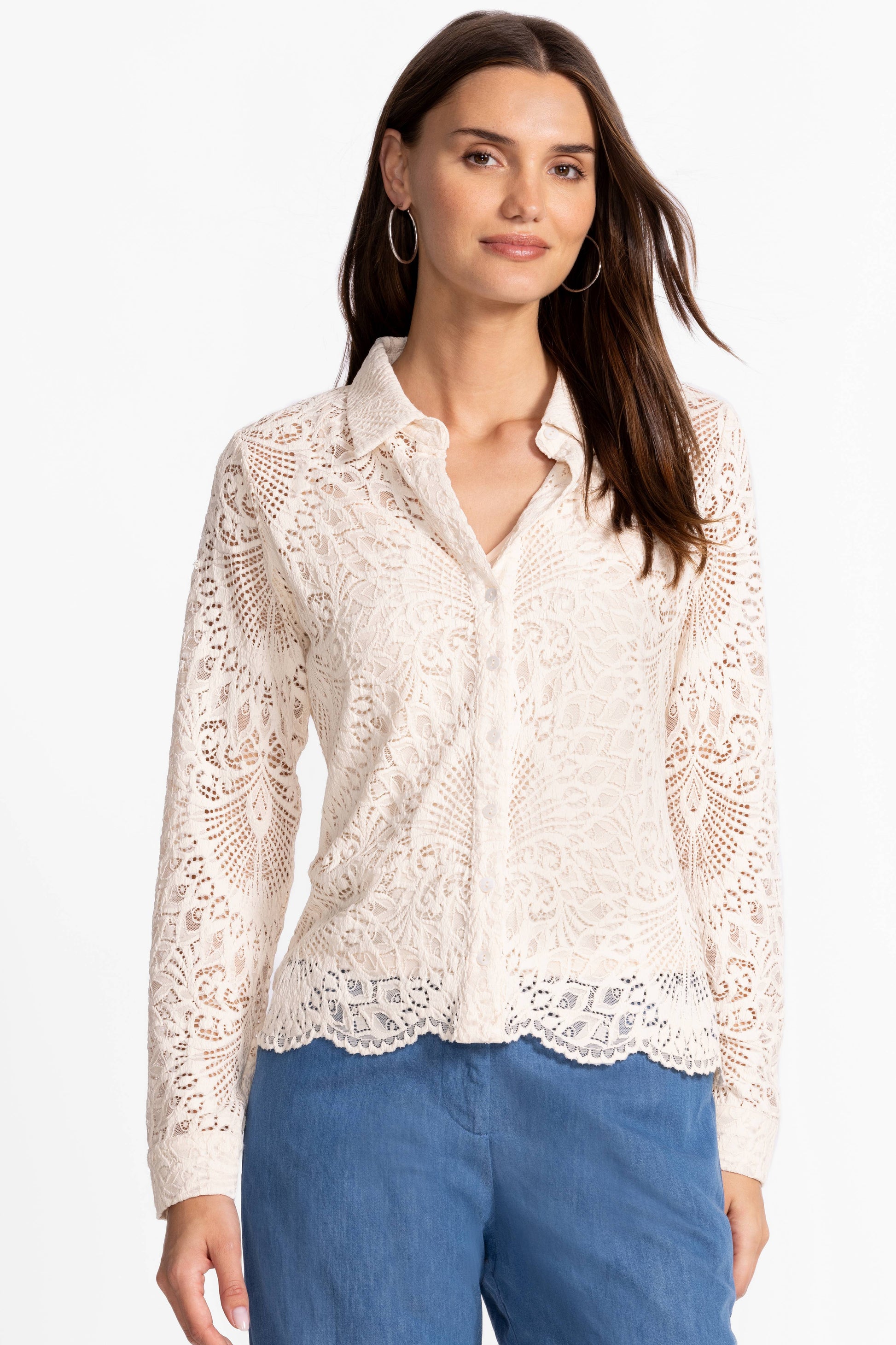 The Devin Button Down Shirt presents a refined feminine interpretation of traditional shirting. Made from lightweight fabric, this collared button-front piece showcases a lace shell with a subtle scalloped hem, complemented by a cami for extra coverage. Combine with tailored pants and matching flats for a sophisticated evening ensemble.