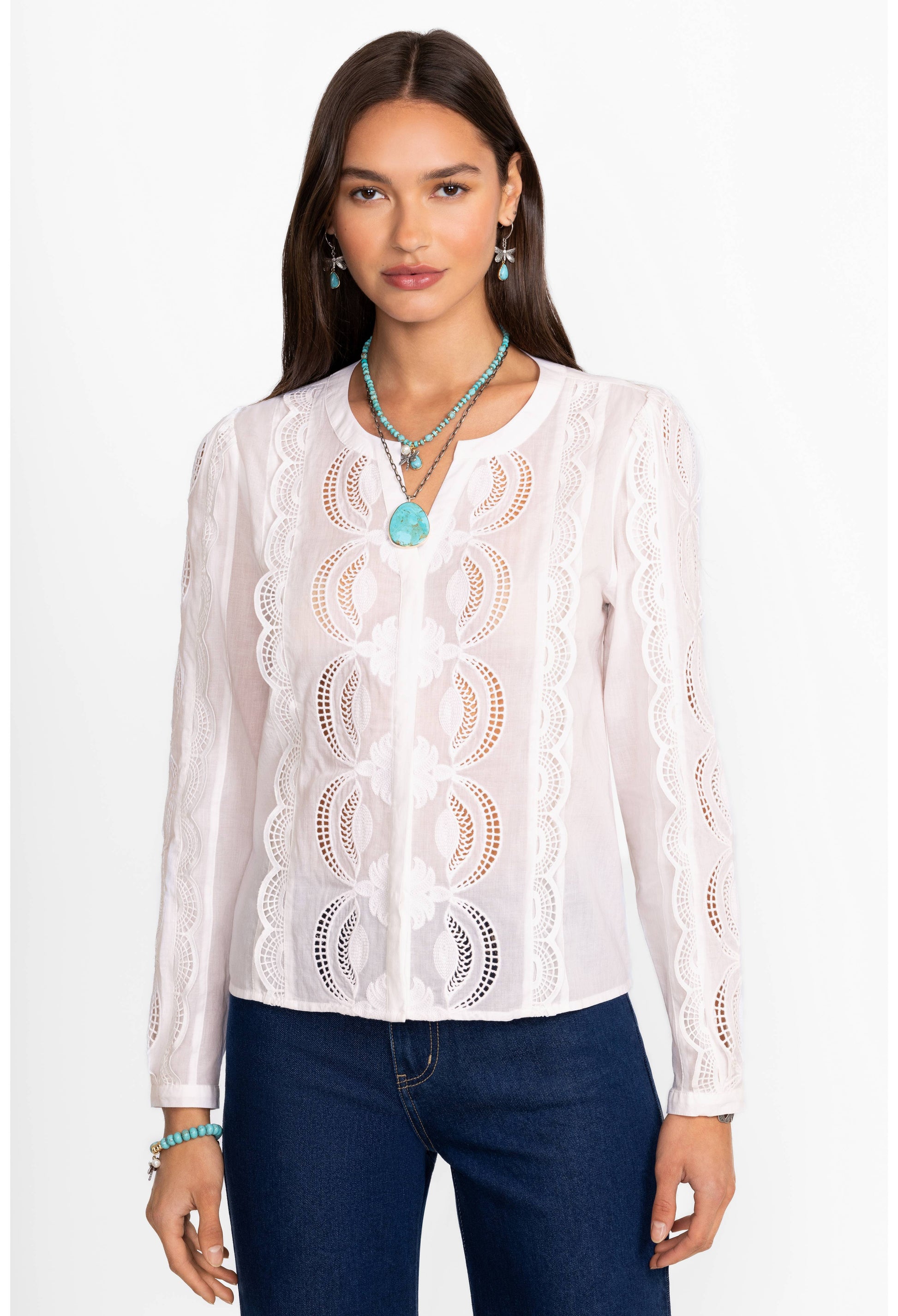 Crafted from 100% breathable cotton, Makaylin Button Up Blouse offers a feminine take on traditional shirting. Featuring delicately scalloped lace voile and floral details throughout the body and sleeves, this elegant top is finished with a classic button-front closure. Pair with a flowing A-line skirt and pumps for a modern office look.