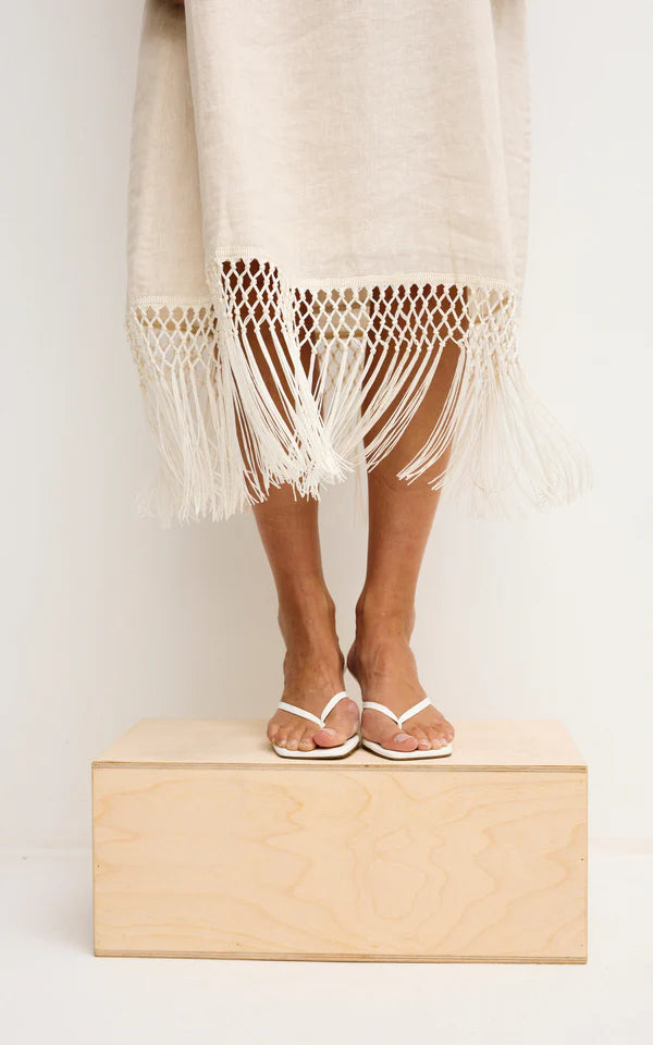 The Kinney Gala Dress in Stone delivers understated refinement through thoughtful design. This sleeveless midi piece showcases a premium linen construction that breathes effortlessly, while its relaxed fit creates a flattering drape across the body. A distinctive macramé-inspired fringed hem introduces subtle texture and visual interest, lending movement and character to your silhouette. A wardrobe essential for those who appreciate understated elegance.