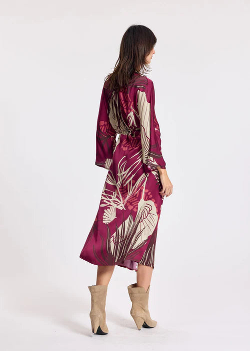 This V-neck blouse features a flowing silhouette inspired by Japanese design, complete with a large front tie that allows for an adjustable fit.