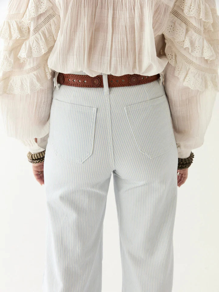 The Edna Pant in Blue Cargo offers a timeless yet dynamic design, blending vintage workwear influences with a subtle rock ’n’ roll edge. Featuring a high waist and wide-leg silhouette, these trousers are made from soft, structured cotton with a hint of elastane for a comfortable, form-fitting wear that improves over time. Pinstripe accents maintain a crisp look, while patch pockets and brass buttons introduce a touch of retro character.