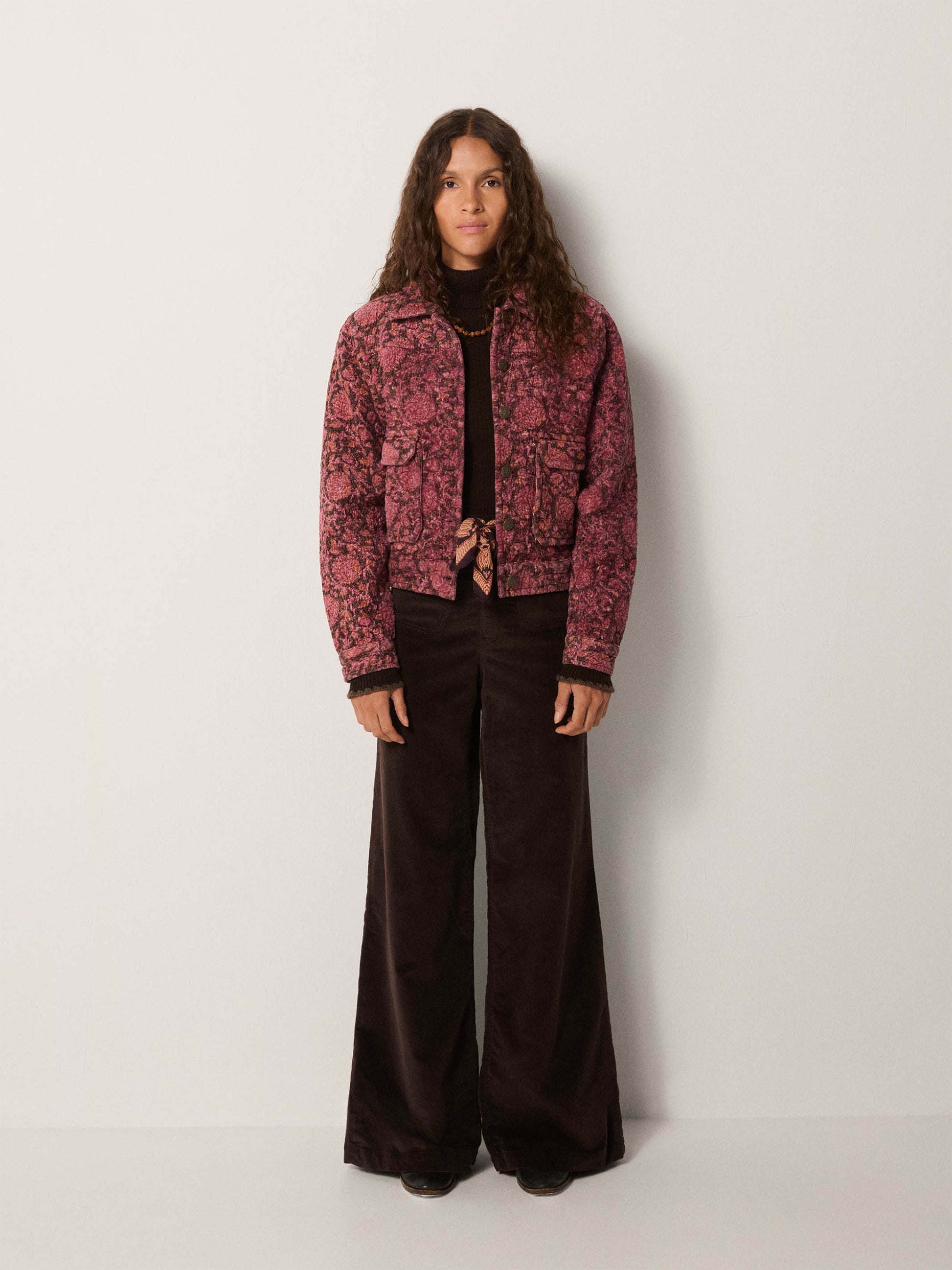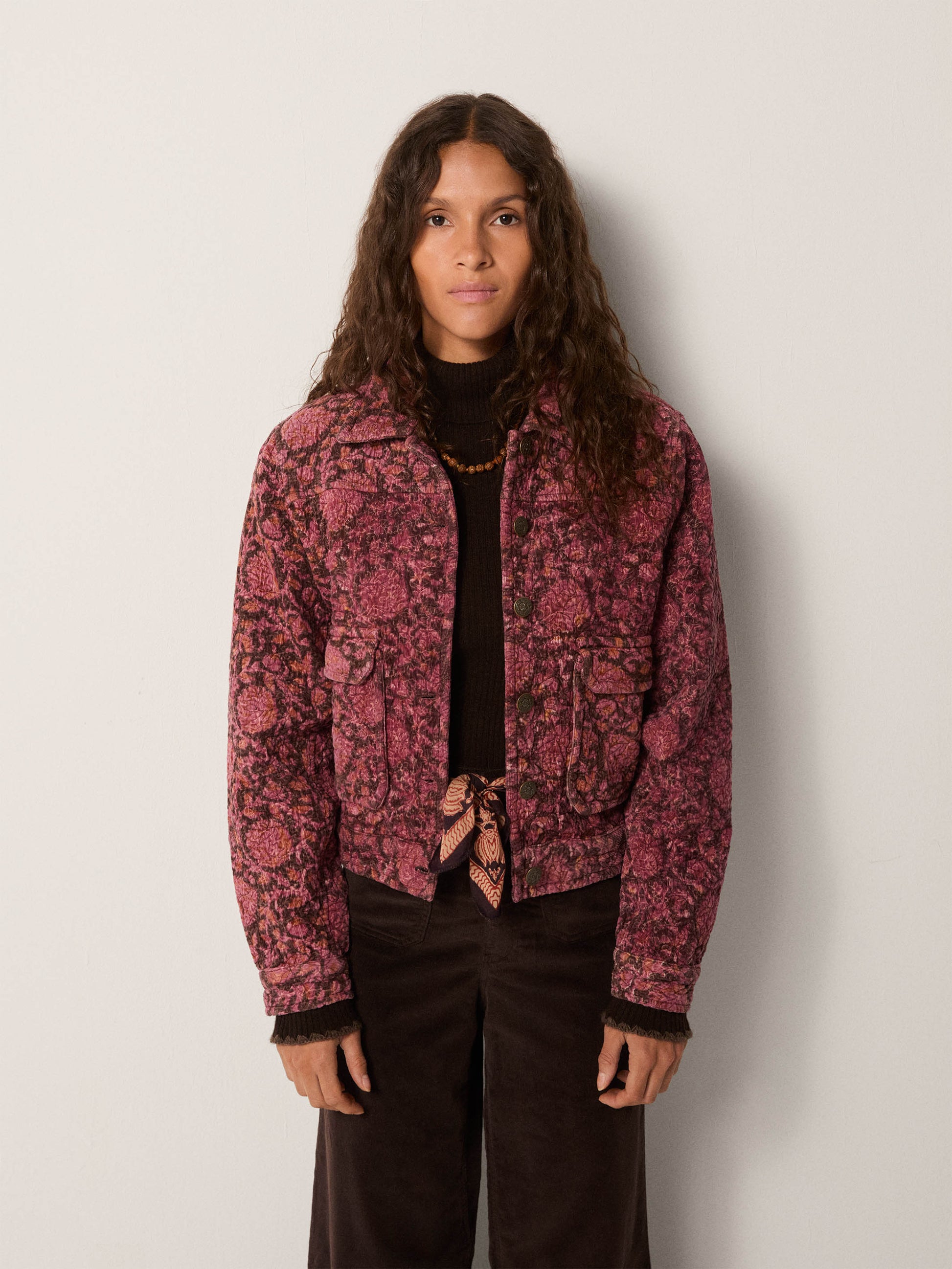 In a micro-corduroy with subtle quilting, this jacket showcases an intricate floral design that evokes vintage textiles rather than contemporary printing. The warm coral and wine tones create a sophisticated, tapestry-like aesthetic. The fabric provides both structure and comfort—the quilting adds dimension without excess weight, while the nubbed surface develops a distinguished patina over time. A collarless silhouette and softly padded shoulders emphasize the dense botanical pattern. Functional front welt pockets and tonal stitching offer understated detailing, while the fine corduroy texture invites tactile appreciation. A piece that reads as thoughtfully curated rather than mass-produced.
