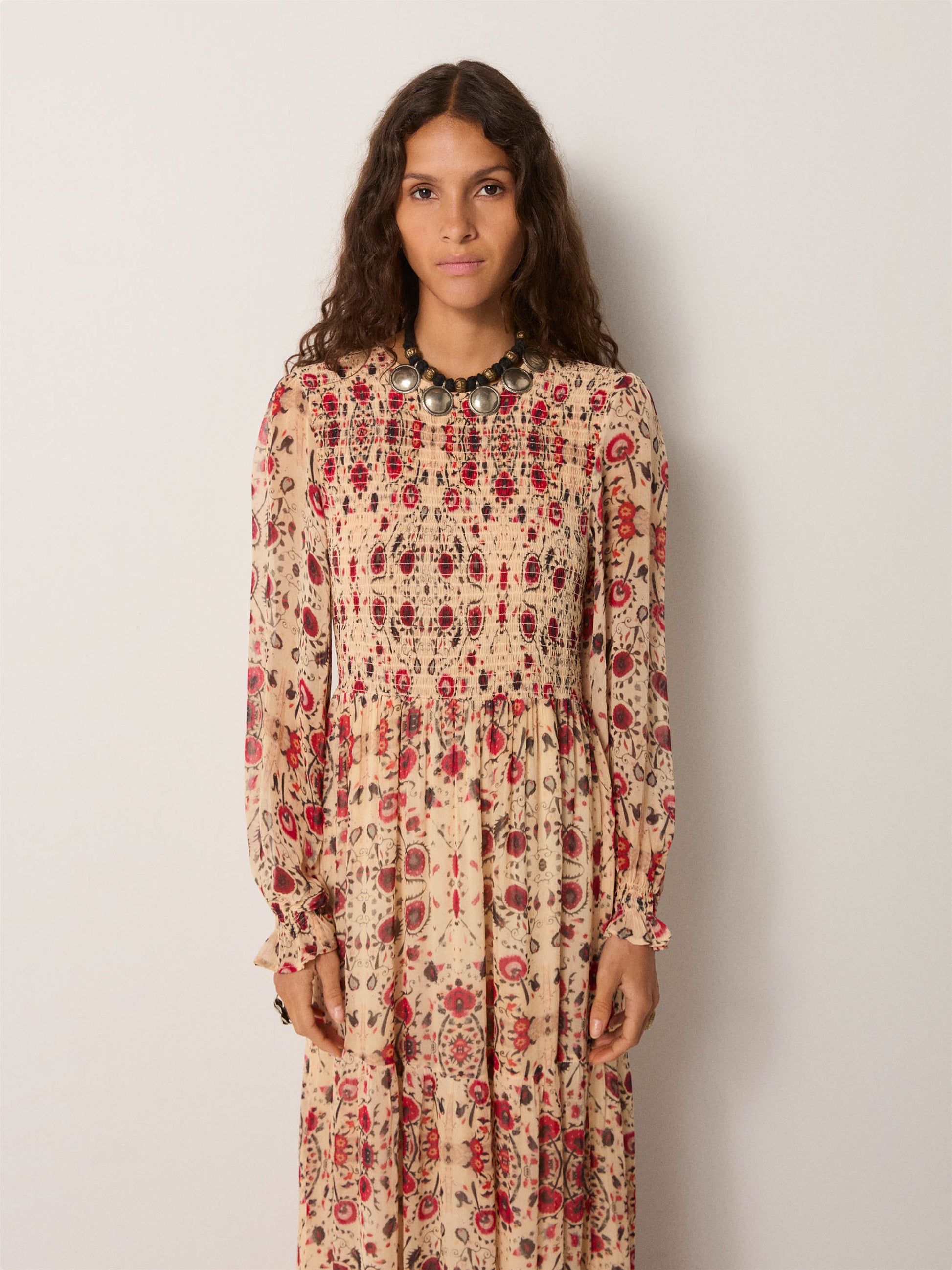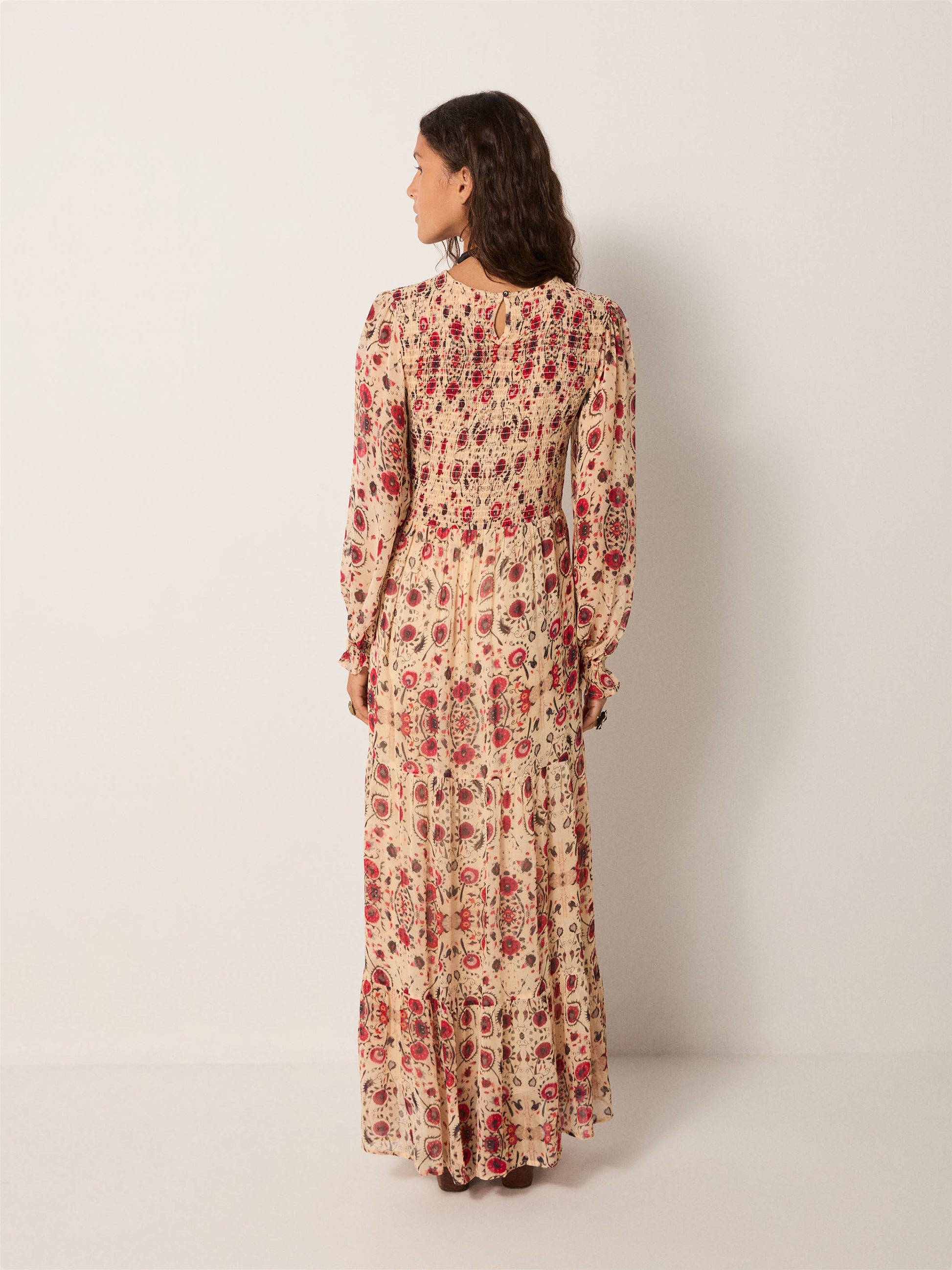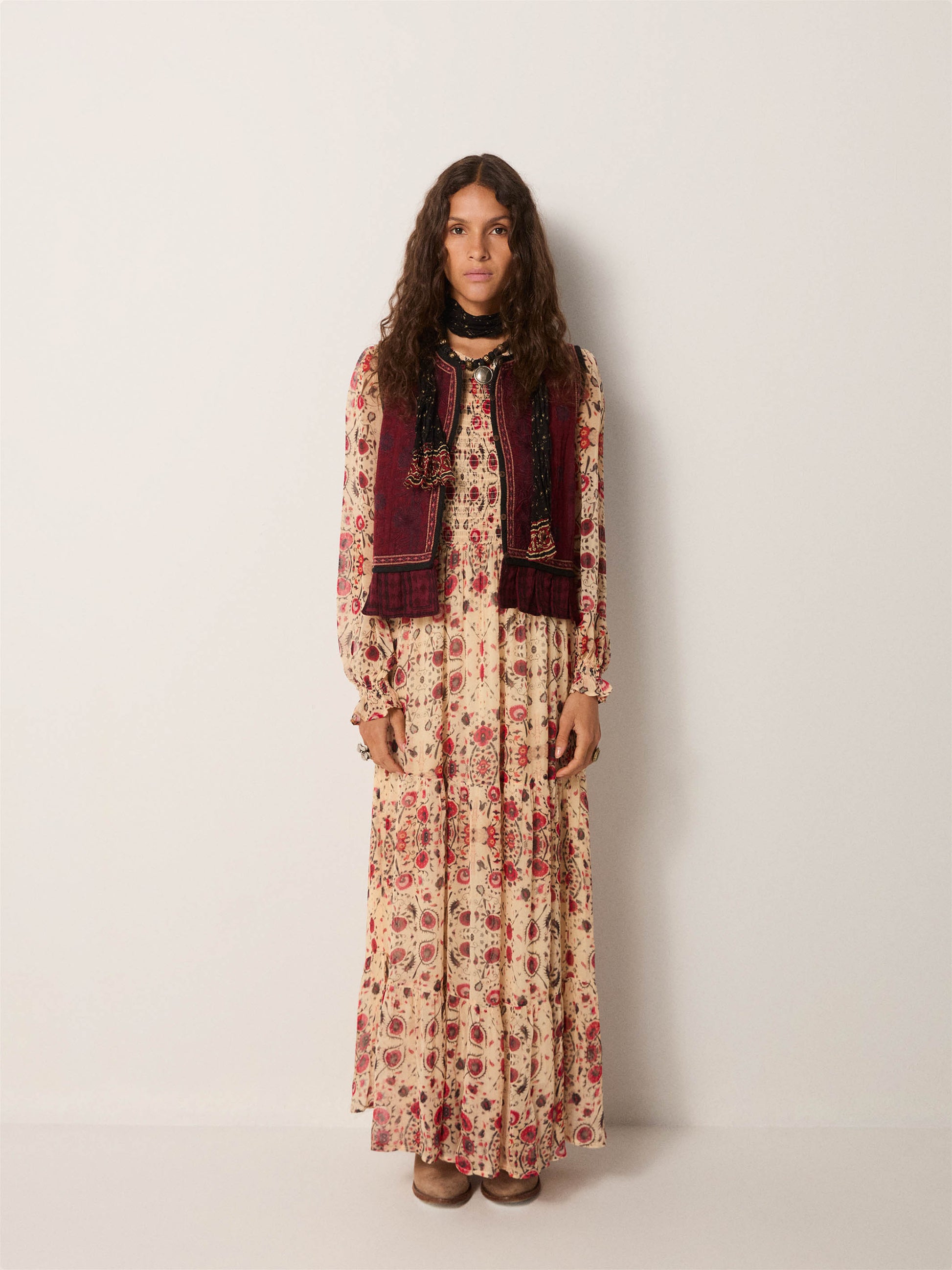 This dress exemplifies considered design through its composition of lightweight viscose with textural depth. The botanical print—rendered in a naturally weathered sandy tone—pairs with strategically placed embroidery that creates visual layering and controlled transparency. The construction prioritizes fluidity without sacrificing structure, allowing the garment to transition seamlessly across contexts: equally suited to minimal summer styling or integrated into layered autumn and winter compositions. A versatile wardrobe essential that demonstrates the sophistication of restraint and functional elegance.