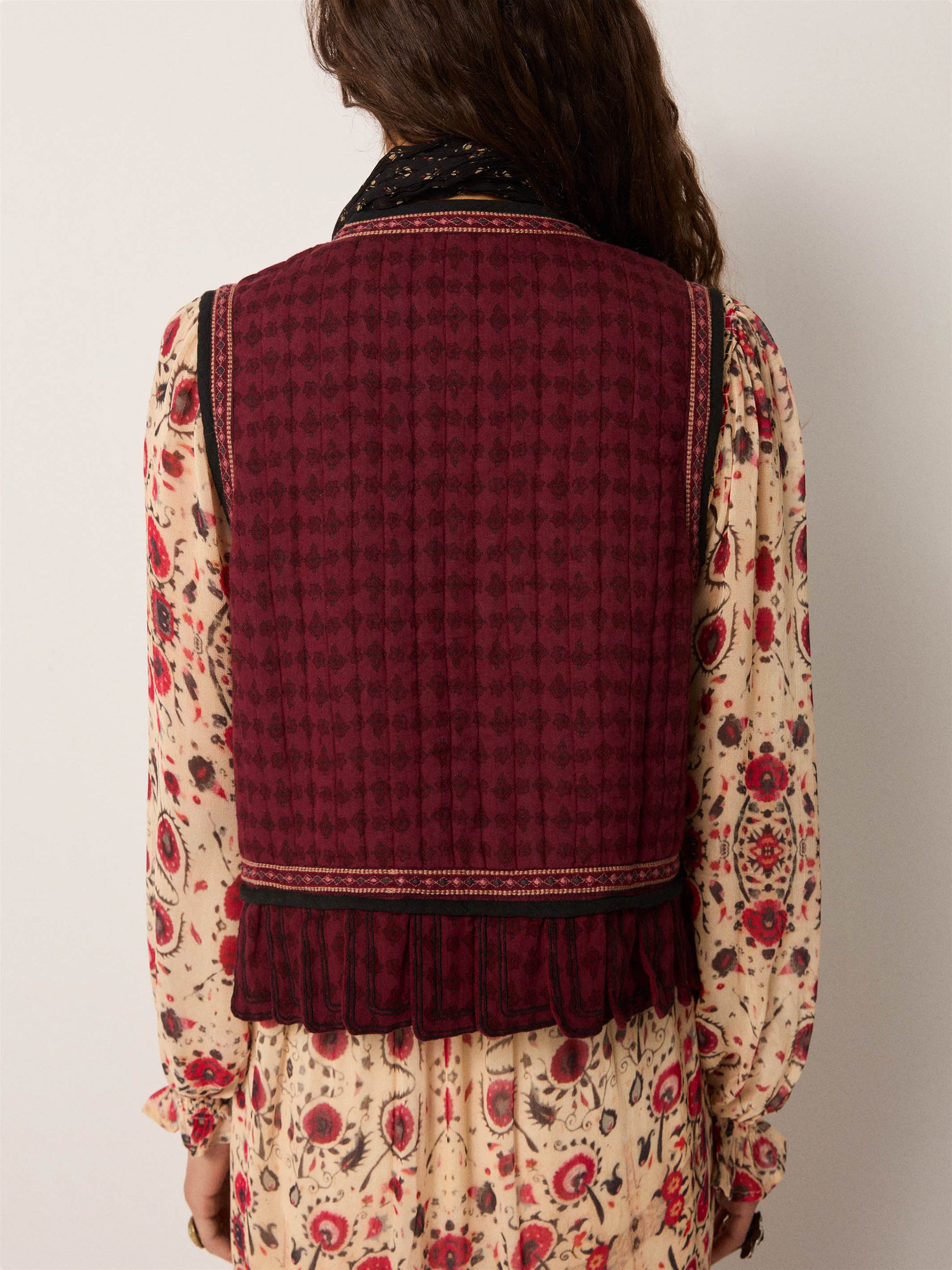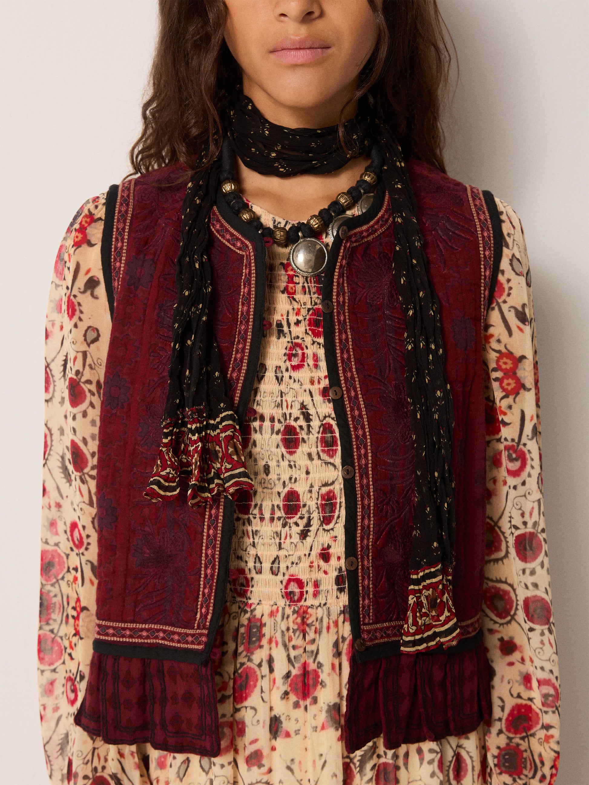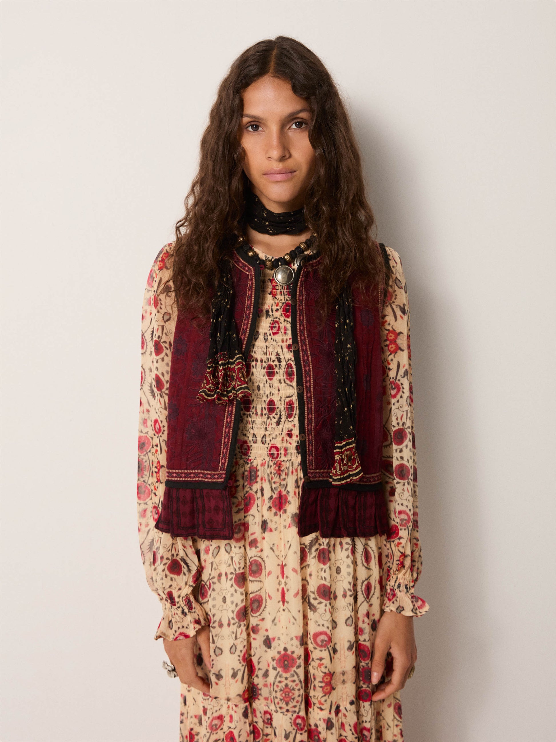 This dress exemplifies considered design through its composition of lightweight viscose with textural depth. The botanical print—rendered in a naturally weathered sandy tone—pairs with strategically placed embroidery that creates visual layering and controlled transparency. The construction prioritizes fluidity without sacrificing structure, allowing the garment to transition seamlessly across contexts: equally suited to minimal summer styling or integrated into layered autumn and winter compositions. A versatile wardrobe essential that demonstrates the sophistication of restraint and functional elegance.