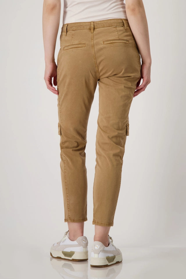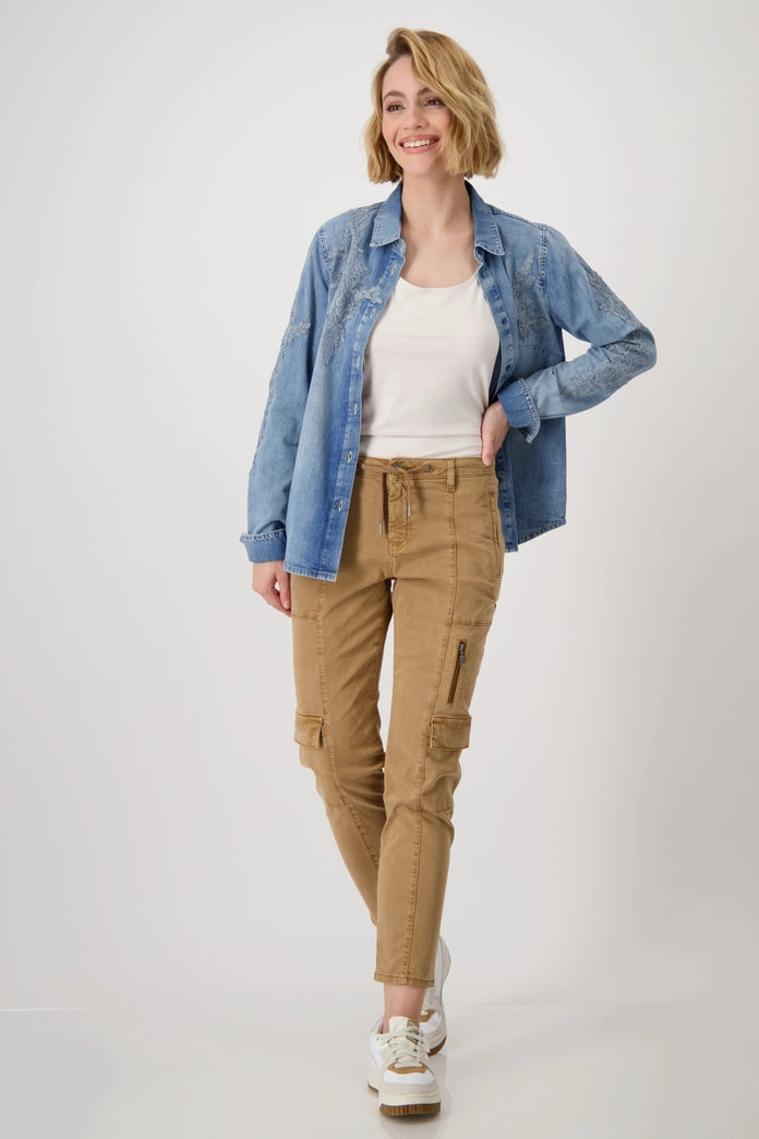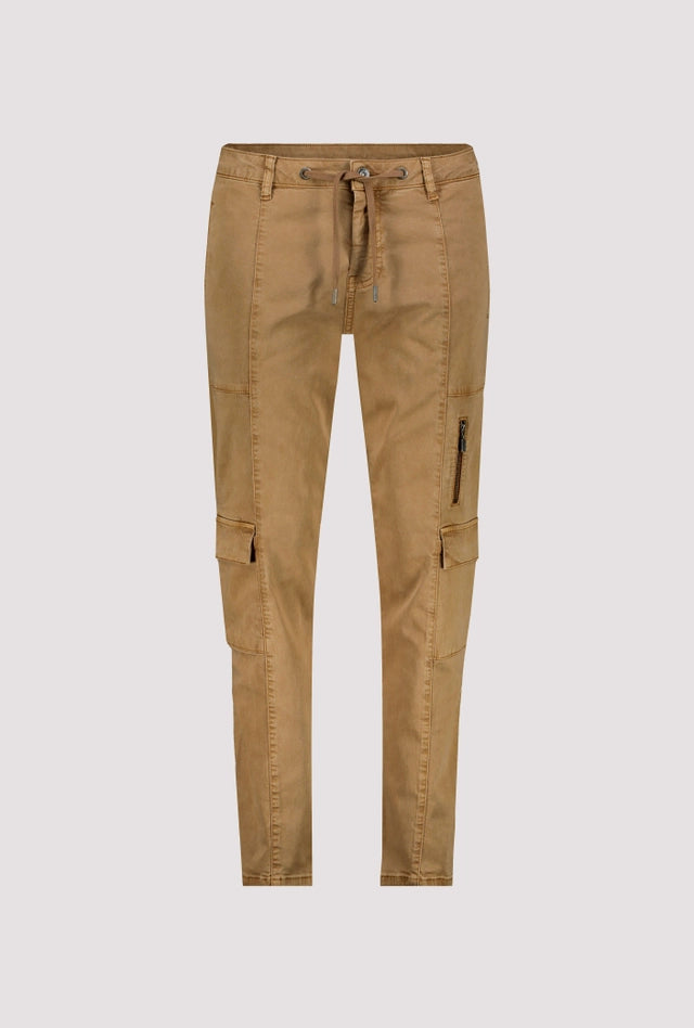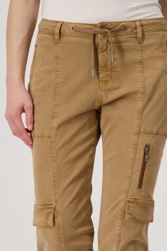 These cargo pants feature a stretchy lyocell fabric with an antique garment-dyed finish. Designed with patch flap pockets, a side pocket, and a decorative zip pocket, they also include a drawstring for an adjustable fit.