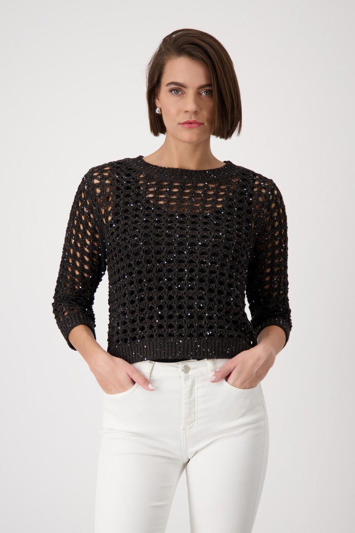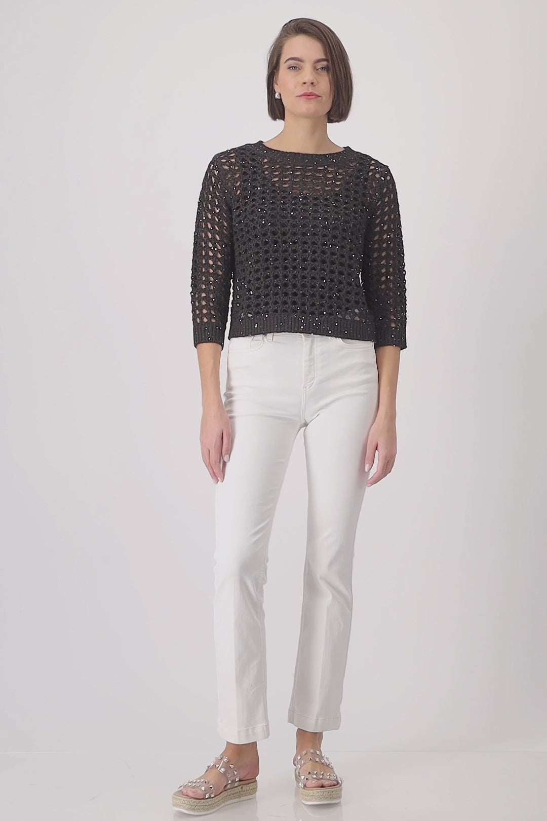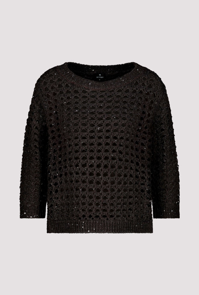 This jumper from Monari features sequin yarn woven into an ajour pattern, it has a regular fit with a round neckline and ¾ raglan sleeves. Ribbed cuffs on the sleeves and hem provide a refined finish.