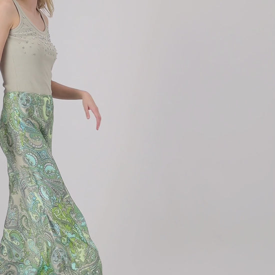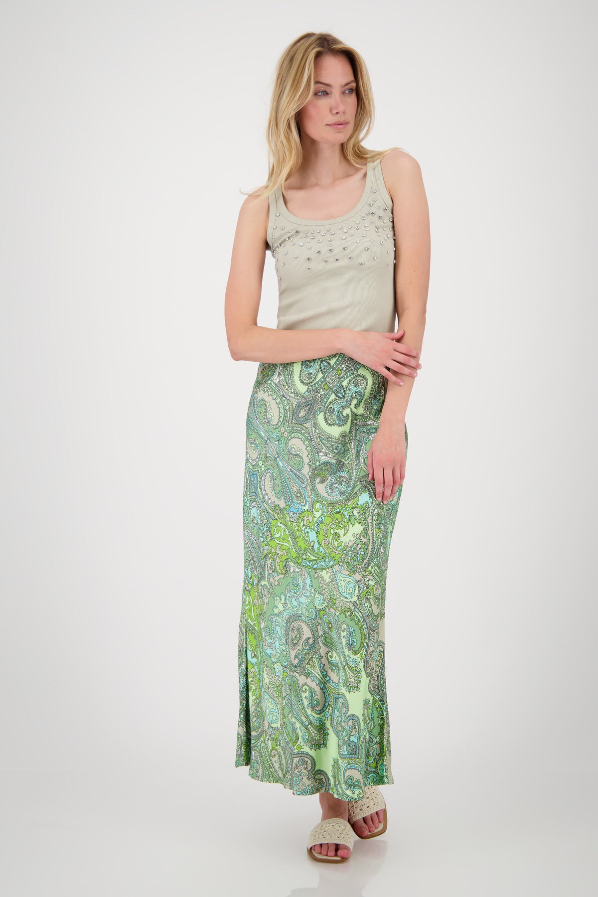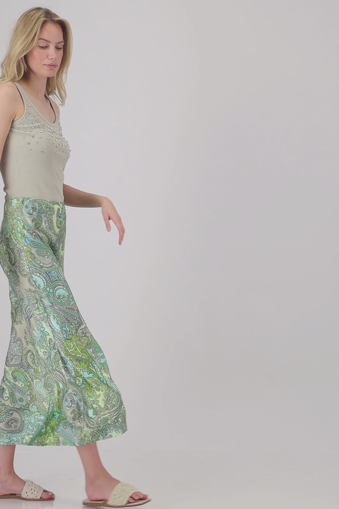 This maxi skirt features a paisley design crafted from 100% viscose with a satin finish. It includes an elasticated hem to ensure a comfortable yet sophisticated silhouette.