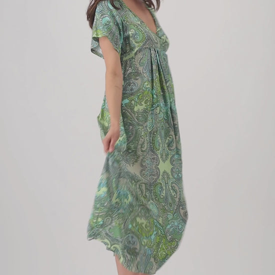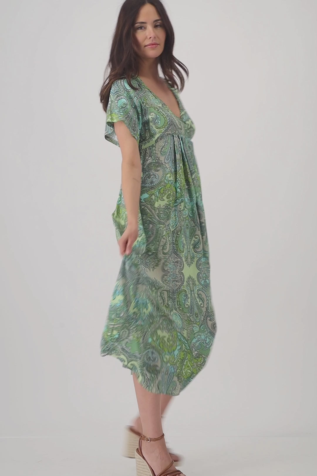 This perfect Summer maxi dress, is made in 100% viscose, features a paisley pattern, a V-neckline, and short sleeves.