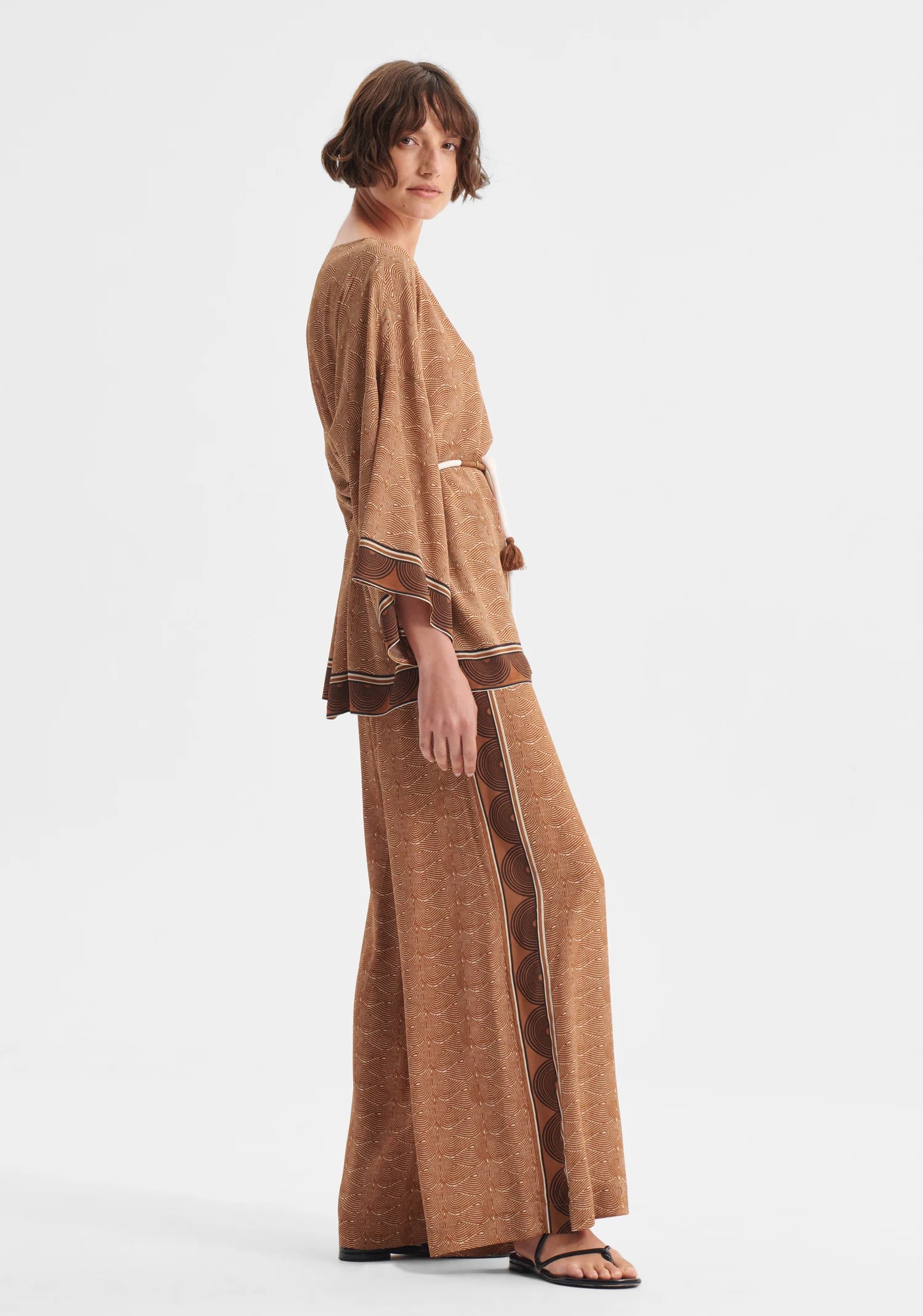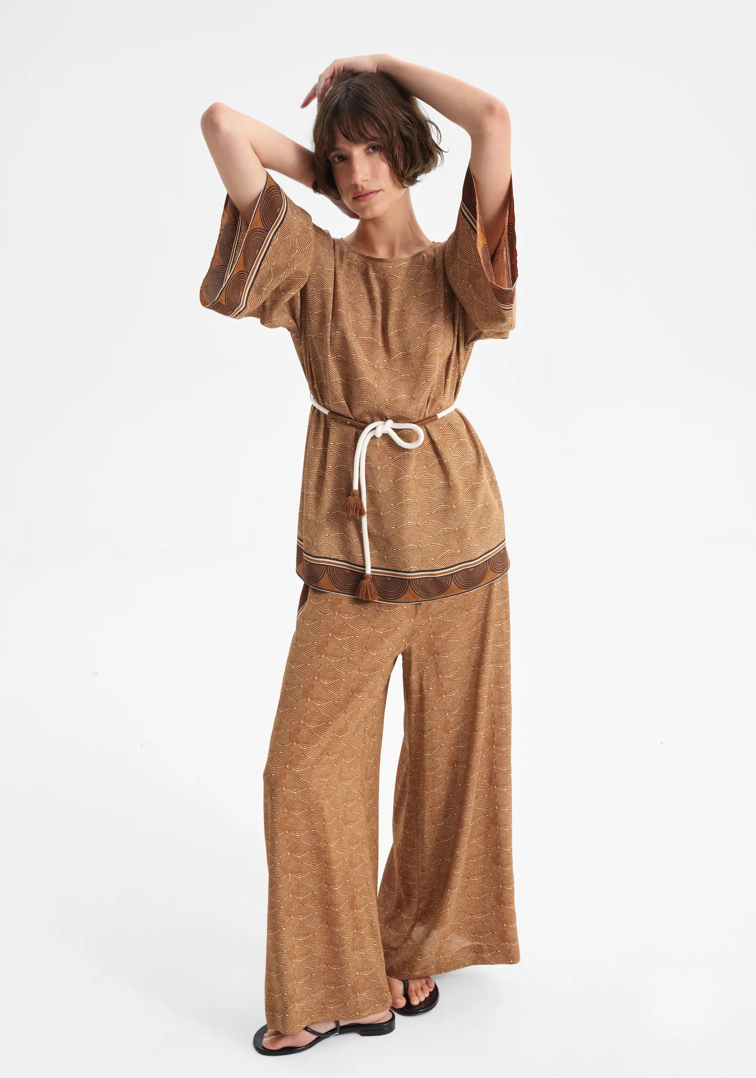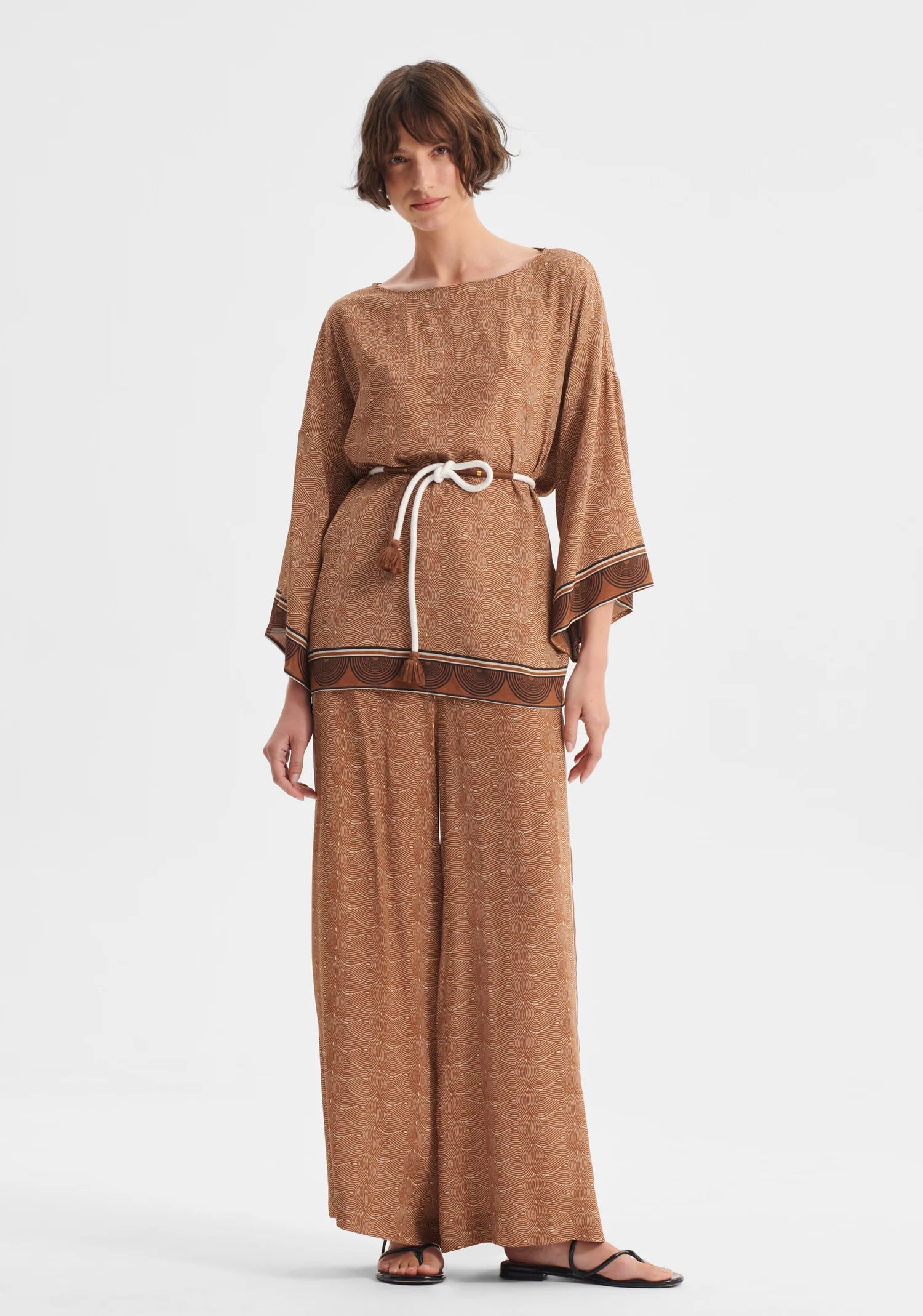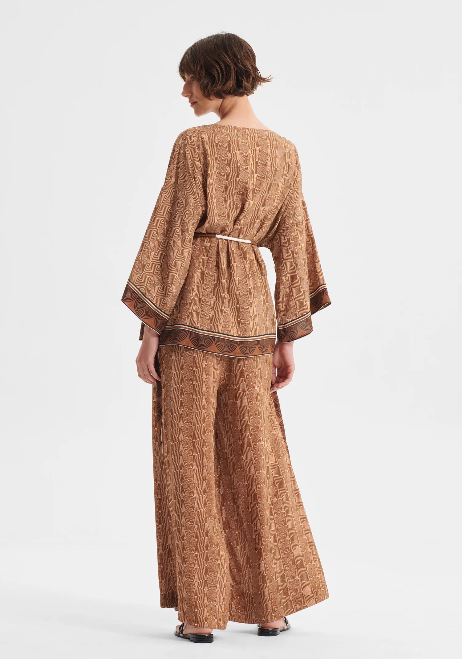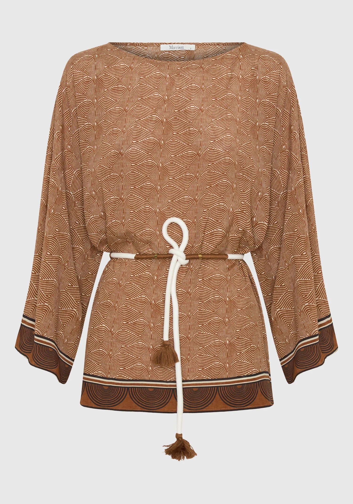 The Rio Top showcases a refined silk blend fabric adorned with our signature Morrison print, with a sophisticated silhouette through its elegant boat neckline and gracefully dropped shoulders. Kimono-style sleeves extend to bracelet length, while strategically placed side splits and a relaxed cut facilitate fluid, unrestricted movement. Decorative border accents frame both the hem and sleeve edges, adding subtle visual interest to this effortlessly wearable piece.