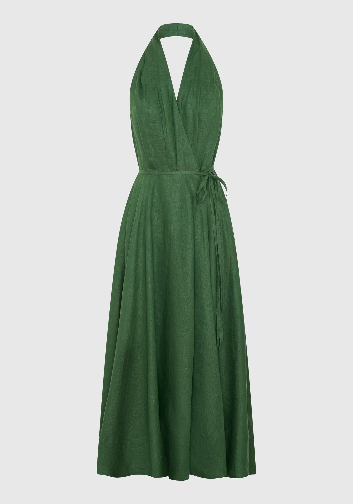 This Morrison linen halter dress combines thoughtful design with effortless elegance. The signature print adorns a silhouette defined by a halter neckline, strategically placed tucks, and a wrap front that transitions into a graceful swing skirt. An elasticated back ensures comfortable movement, while the full lining provides refined coverage. Cut to above-ankle length, this piece delivers a polished, understated aesthetic perfect for warm-weather dressing.