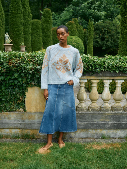 This elegant knit combines the softness of mohair and wool for exceptional comfort and warmth. Designed with a relaxed boxy silhouette, it has a distinctive two-tone intarsia pattern with a textured, fuzzy surface. T