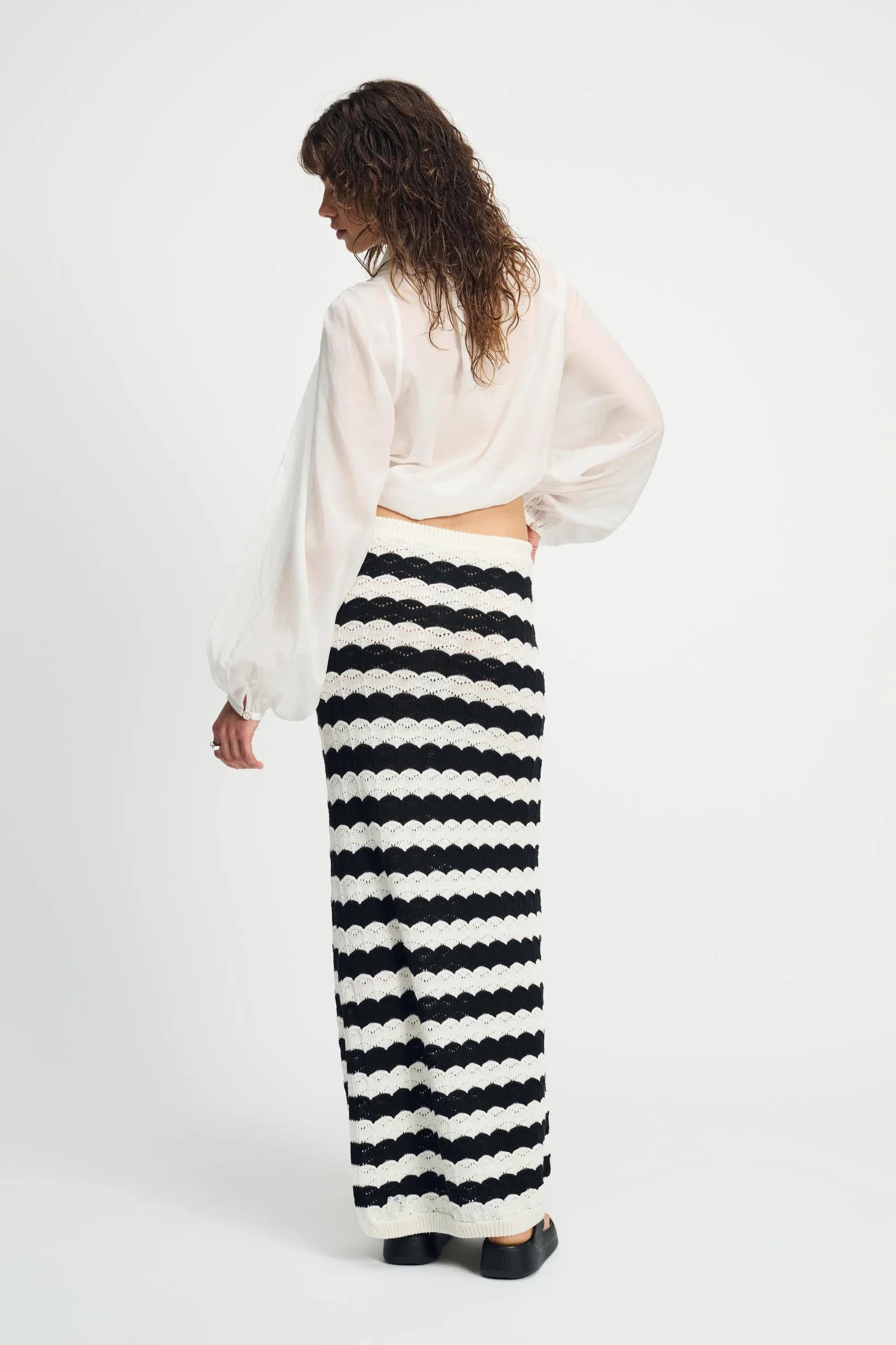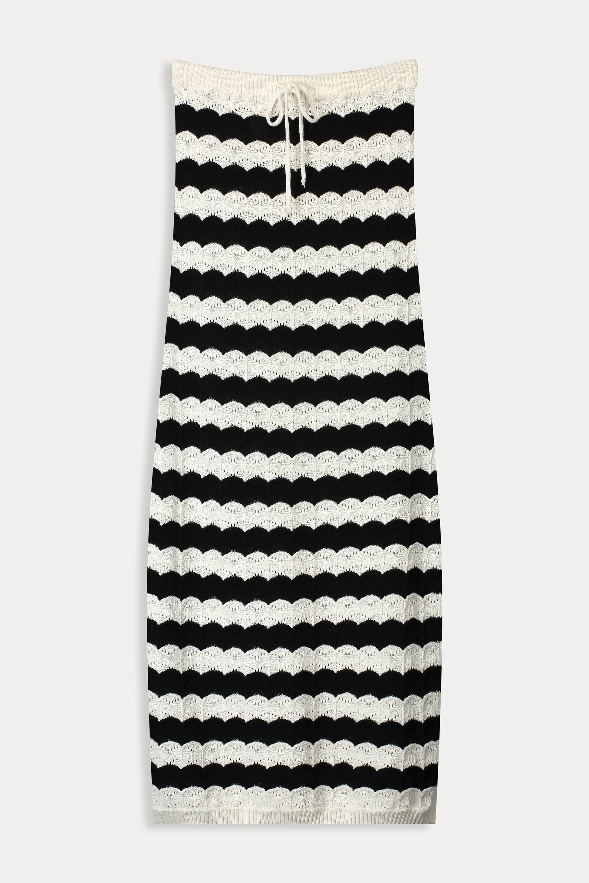 Prepare for summer with this stunning black and white striped maxi skirt. Crafted in crochet knit, it seamlessly blends style and comfort, featuring a bow tie detail at the waistband for an elegant finish.