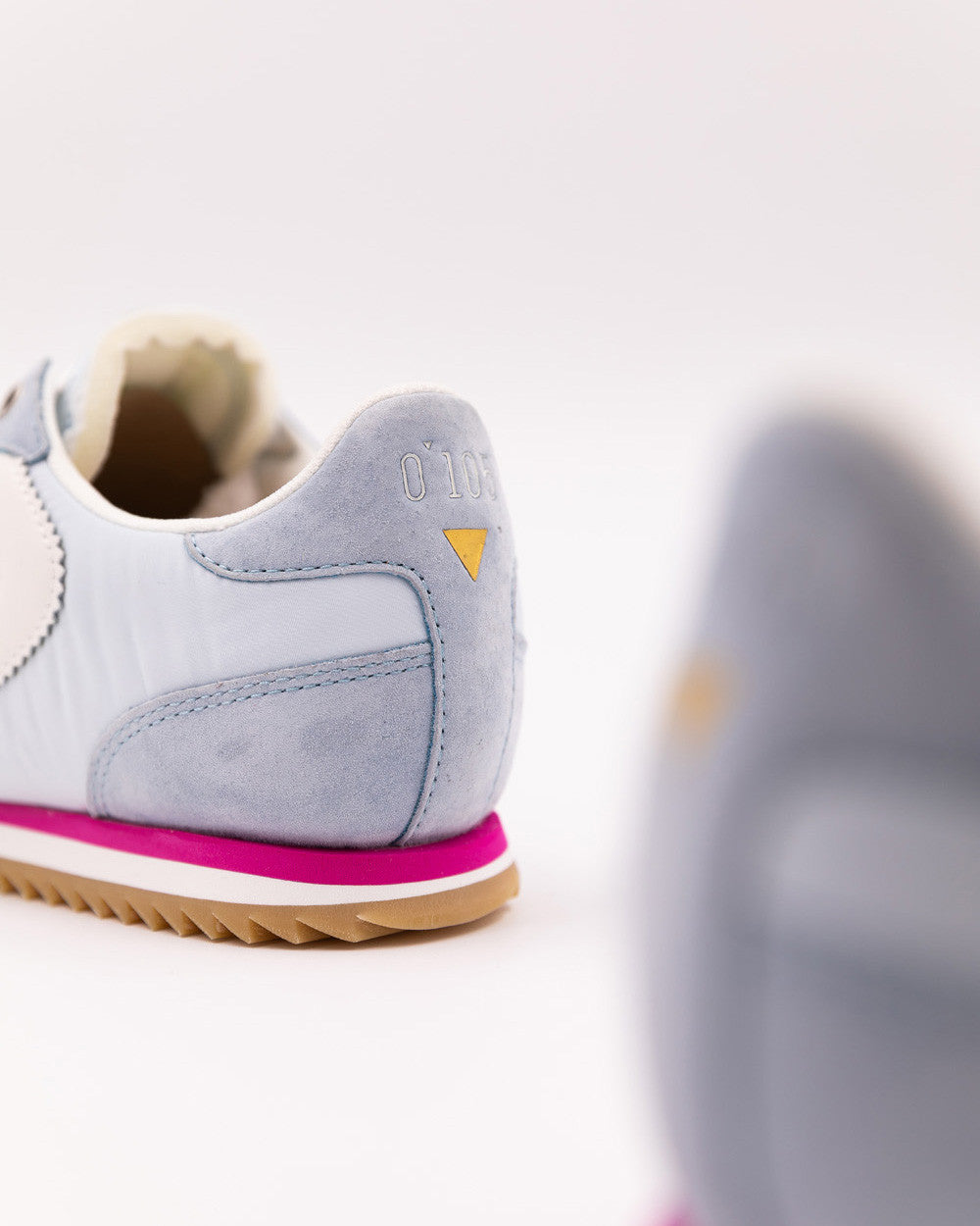 The Lina Baby Blue reimagines the classic running silhouette with contemporary refinement. Sky blue nylon pairs seamlessly with coordinating suede accents, creating a soft, cohesive foundation. Vibrant fuchsia stitching and sole detailing introduce an unexpected dynamic element, elevating the design beyond conventional minimalism. Thoughtfully engineered for both style and comfort, this sneaker arrives with dual lacing options - including a textured fluffy variant - allowing for personalized expression. Lightweight and effortlessly wearable, it brings sophisticated energy to seasonal wardrobes while maintaining an air of understated femininity.