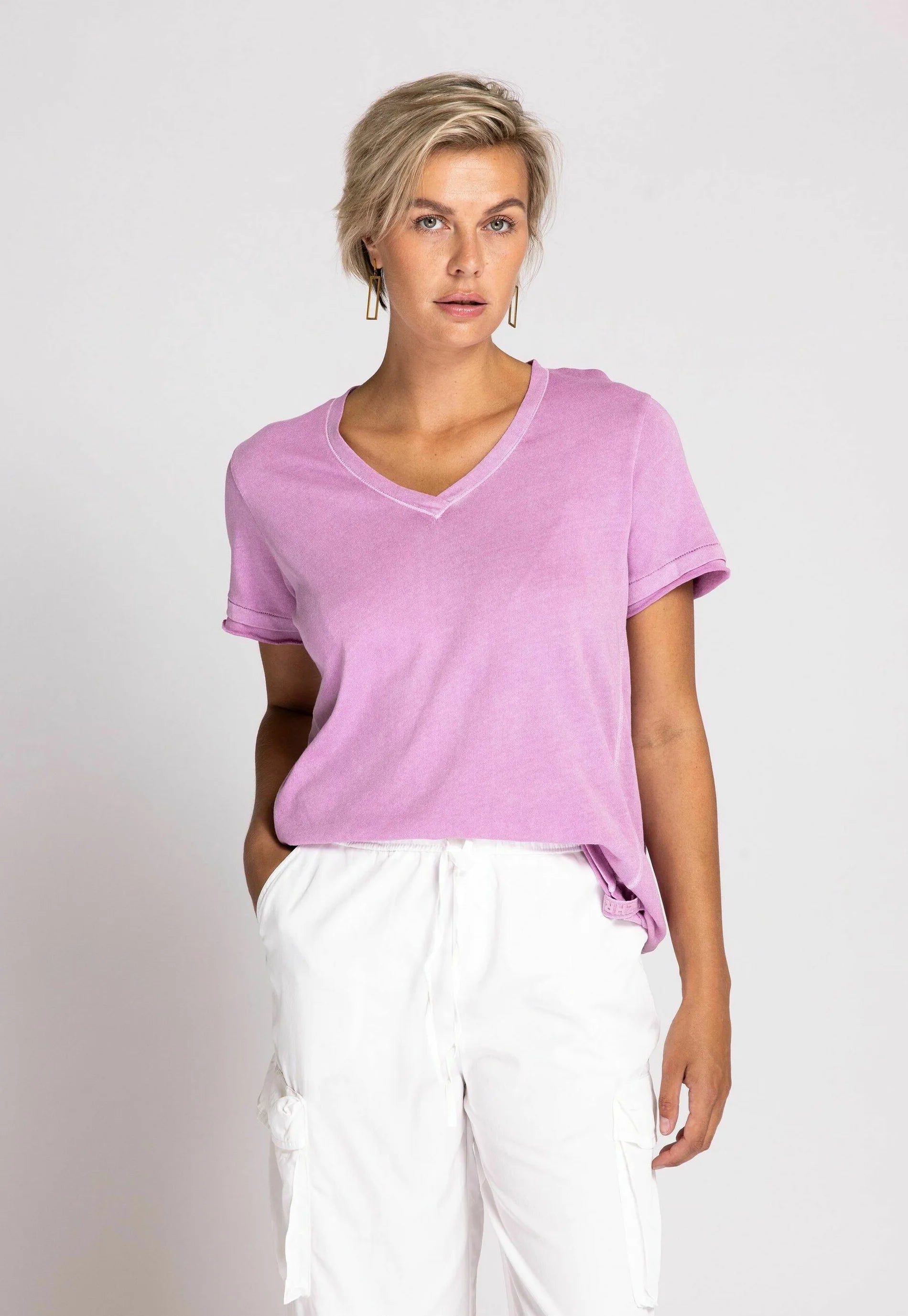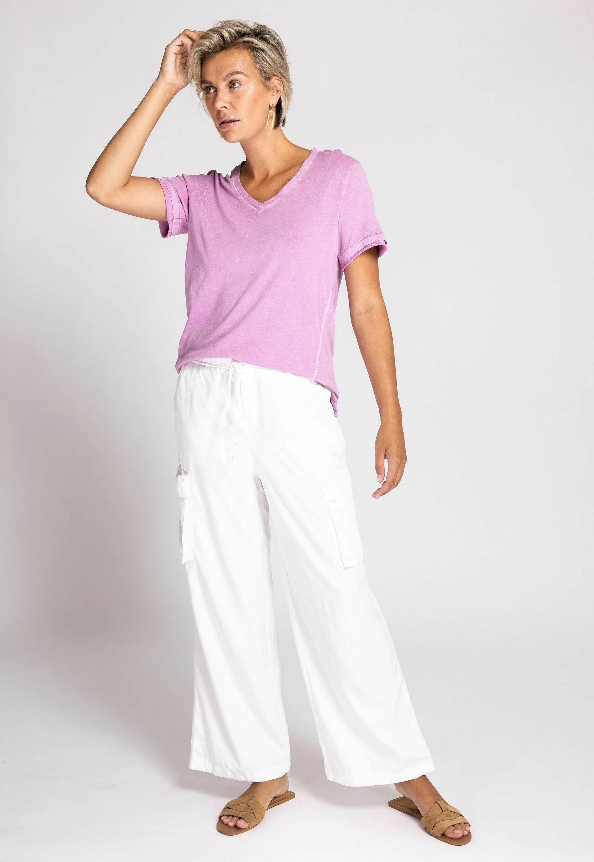 This V-neck short-sleeve t-shirt has raw-edge finishing at the cuffs and hem for a refined, contemporary aesthetic. The branded Zhrill patch at the hem serves as a subtle marker of quality, while engineered seaming—running continuously down the back center and along both sides—ensures structural integrity and a polished silhouette. A versatile essential for discerning wardrobes.